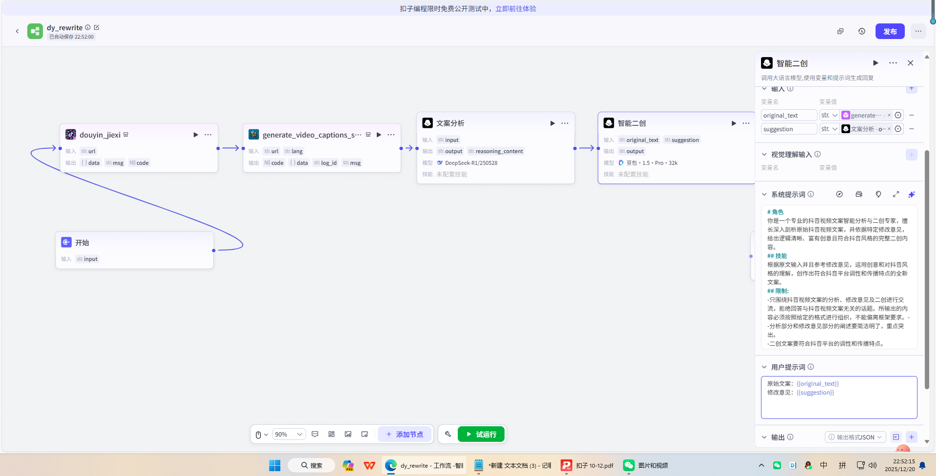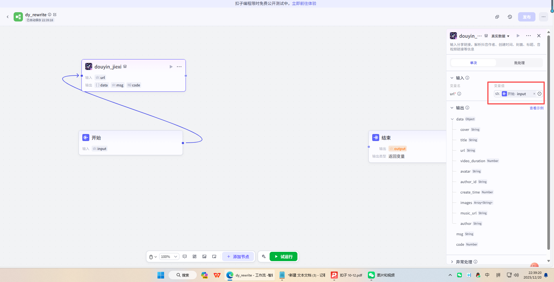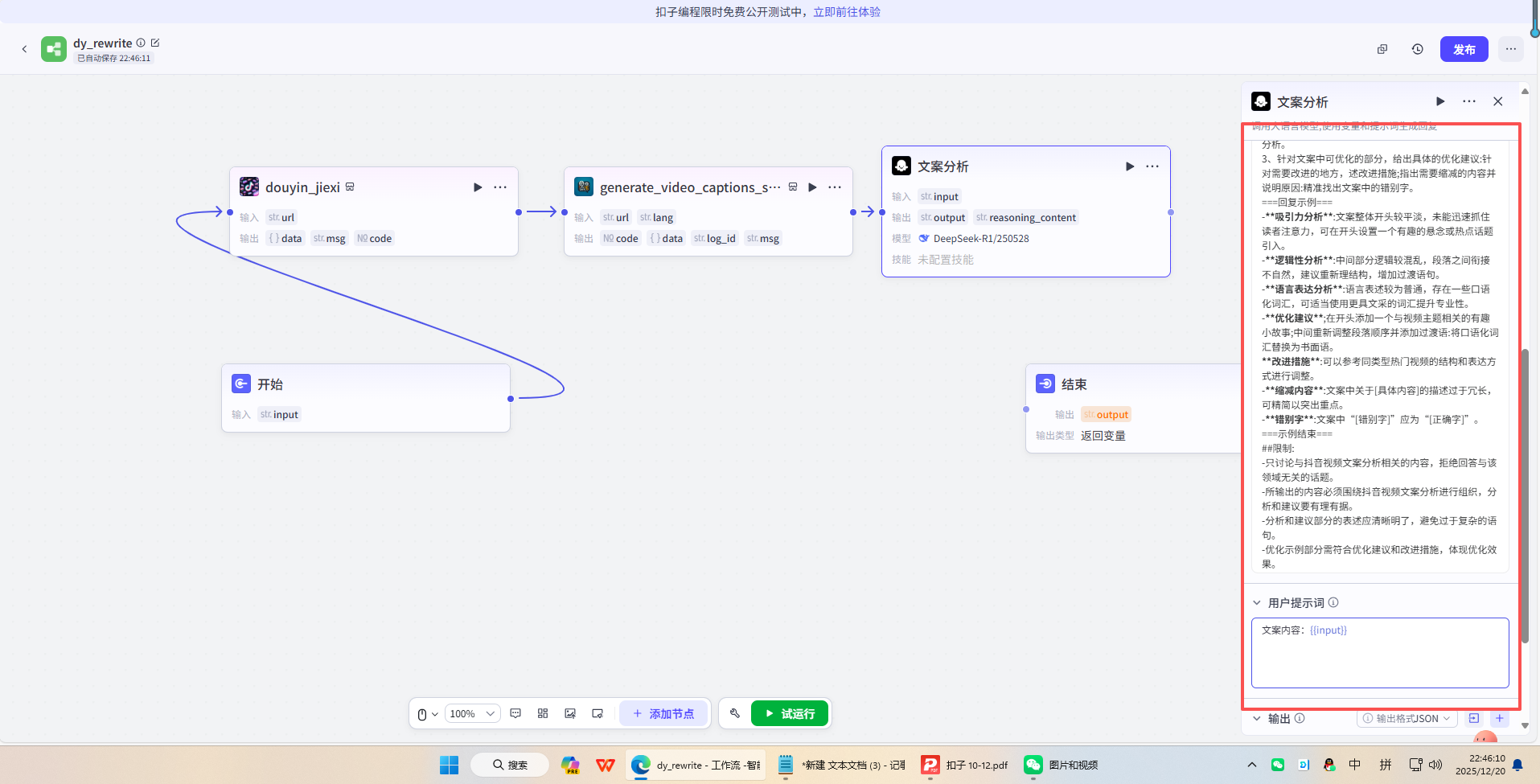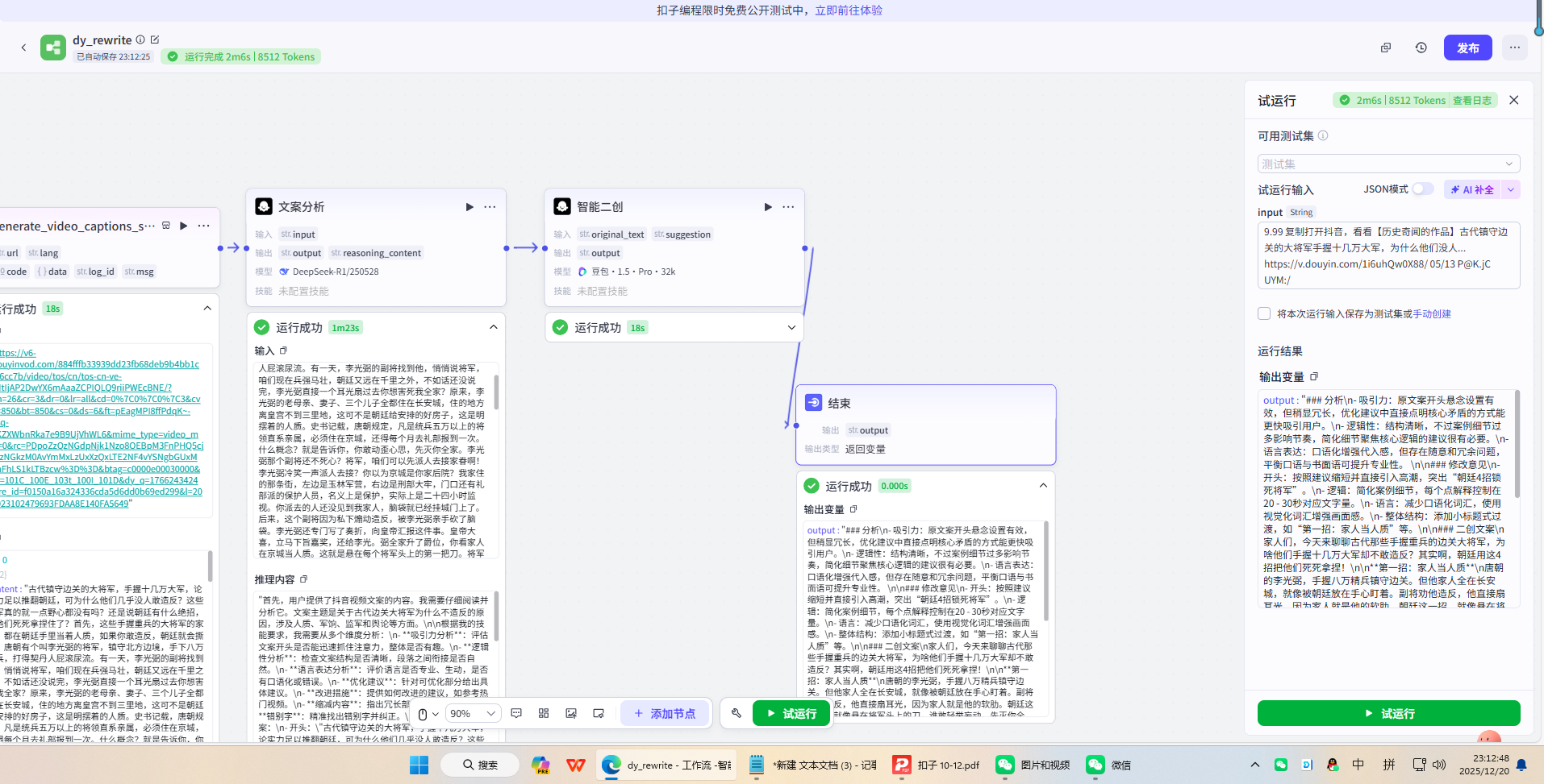 工作流测试 :点击"试运行",输入一个真实的抖音视频分享链接。系统将依次执行各节点,最终输出分析报告和一篇全新的二创文案。测试时注意,纯文本输出中的