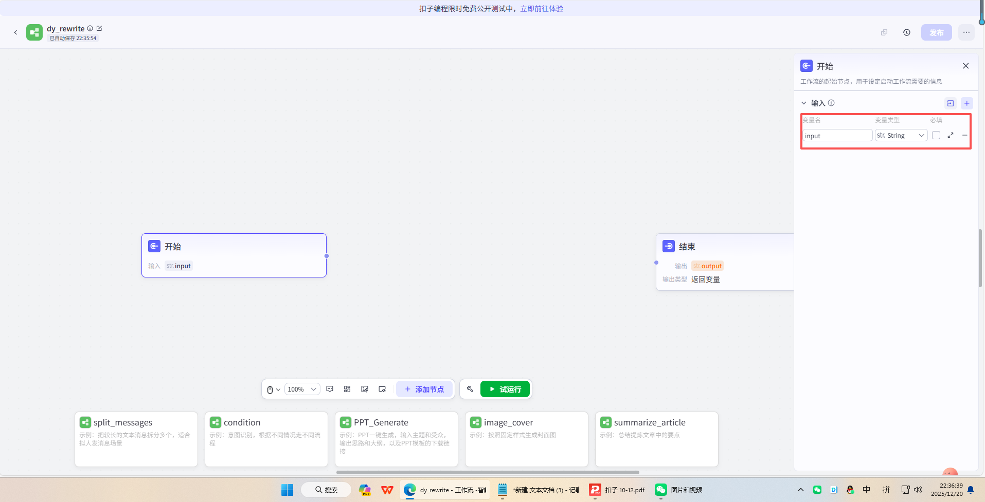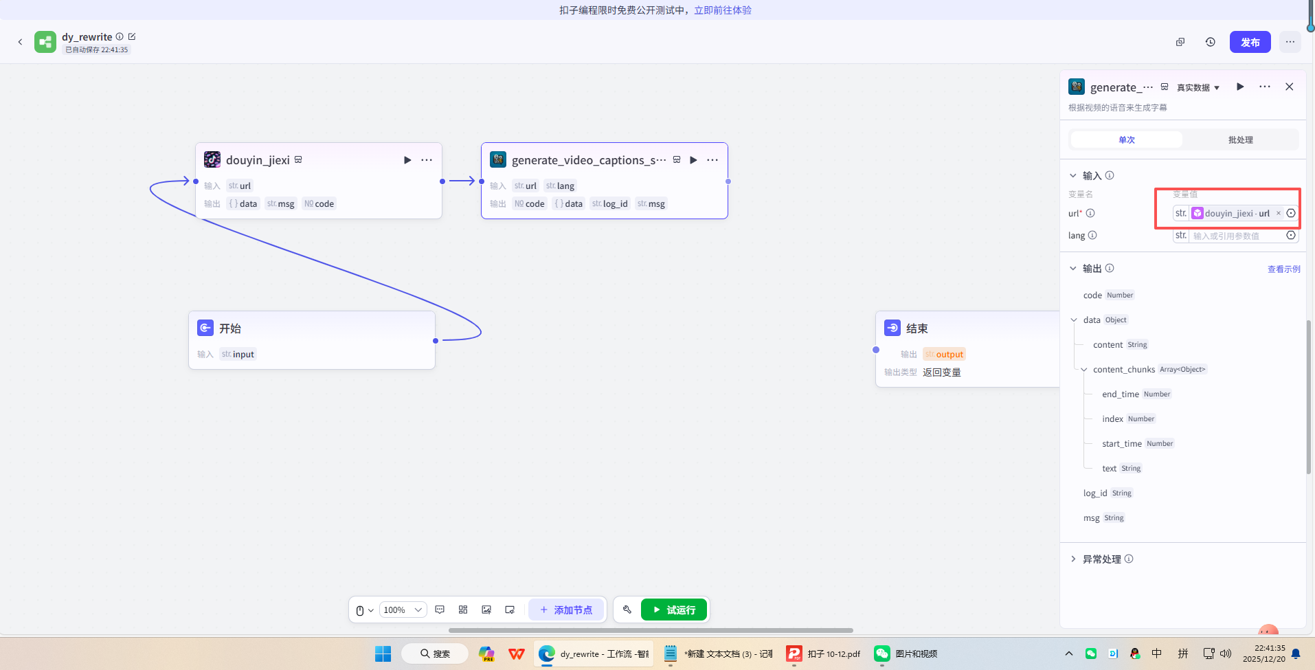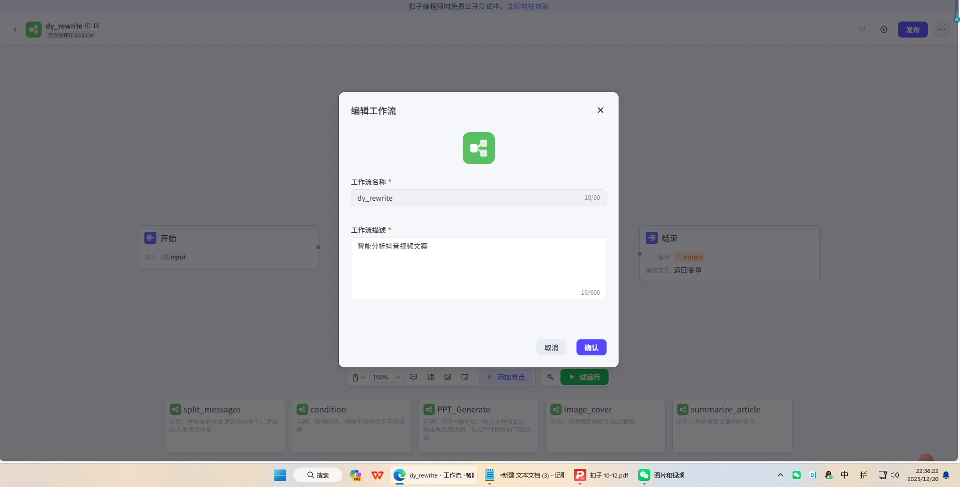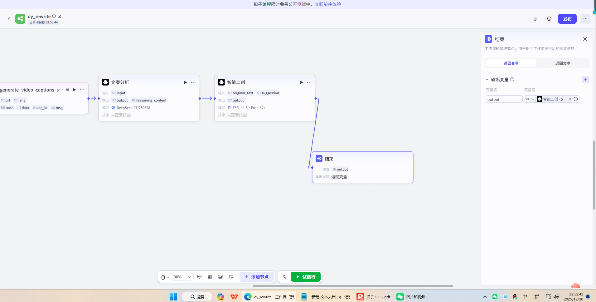 工作流测试 :点击"试运行",输入一个真实的抖音视频分享链接。系统将依次执行各节点,最终输出分析报告和一篇全新的二创文案。测试时注意,纯文本输出中的