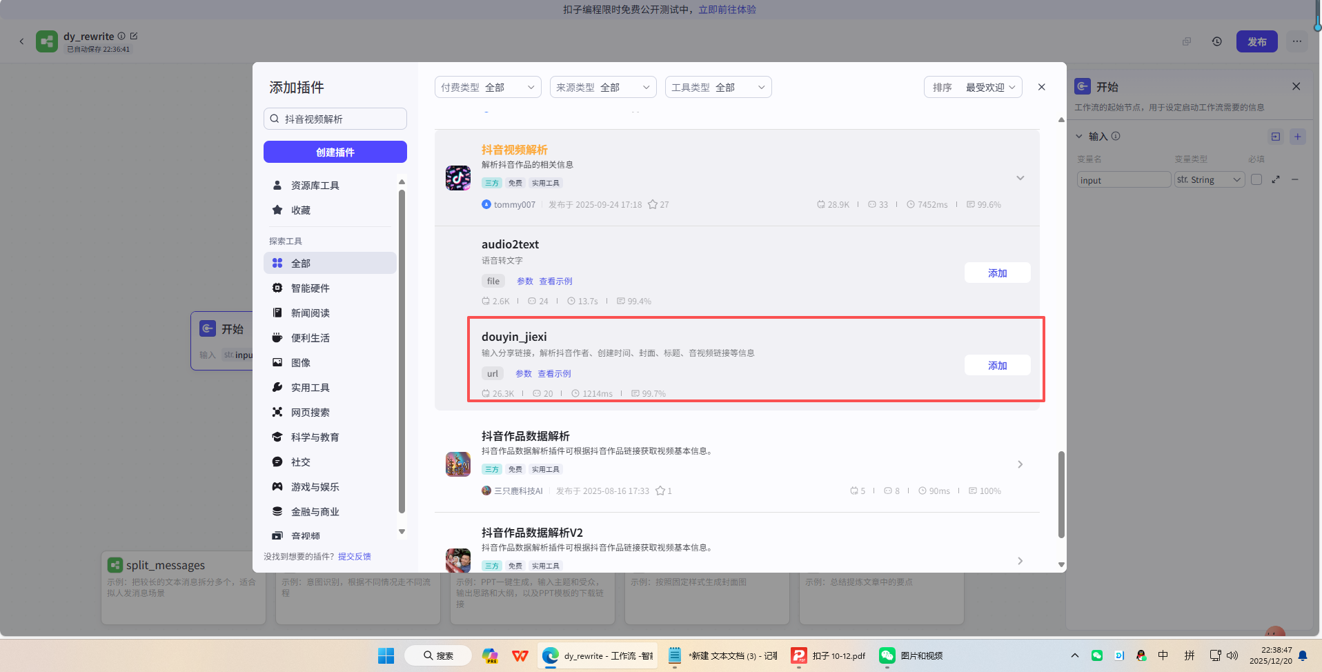 搜索插件 :在插件商店中搜索"抖音视频解析 ",选择并添加一个可用的插件(例如
