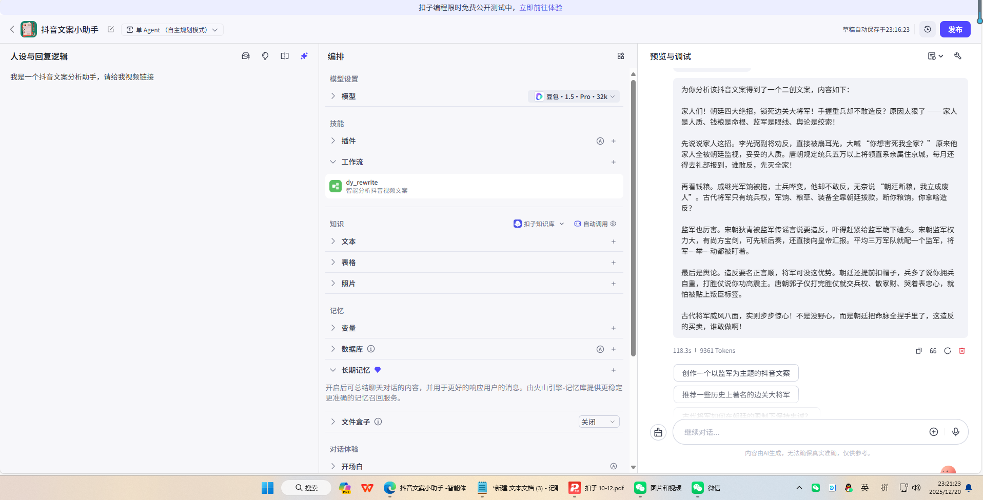 封装为智能体 (可选):创建一个新的智能体(如"抖音文案小助手"),在其技能中关联已发布的