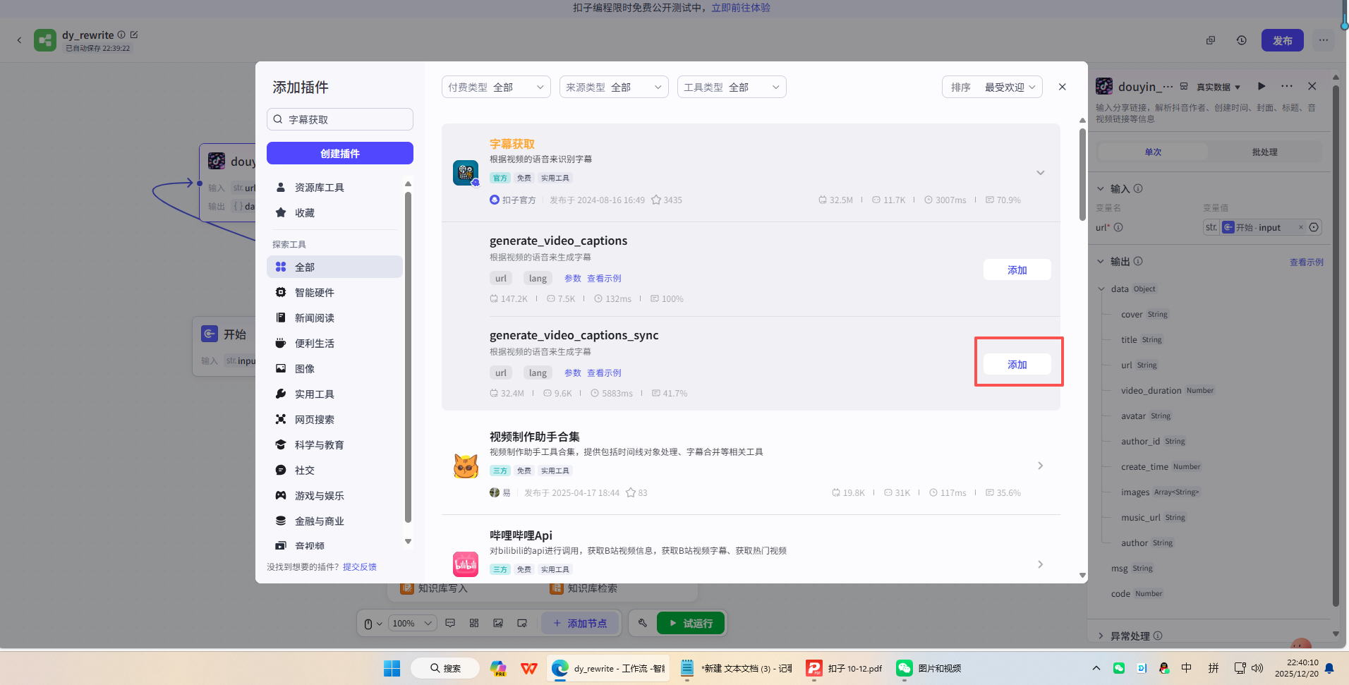 添加节点 :同样添加一个插件节点,搜索"字幕获取 "或类似功能插件(例如