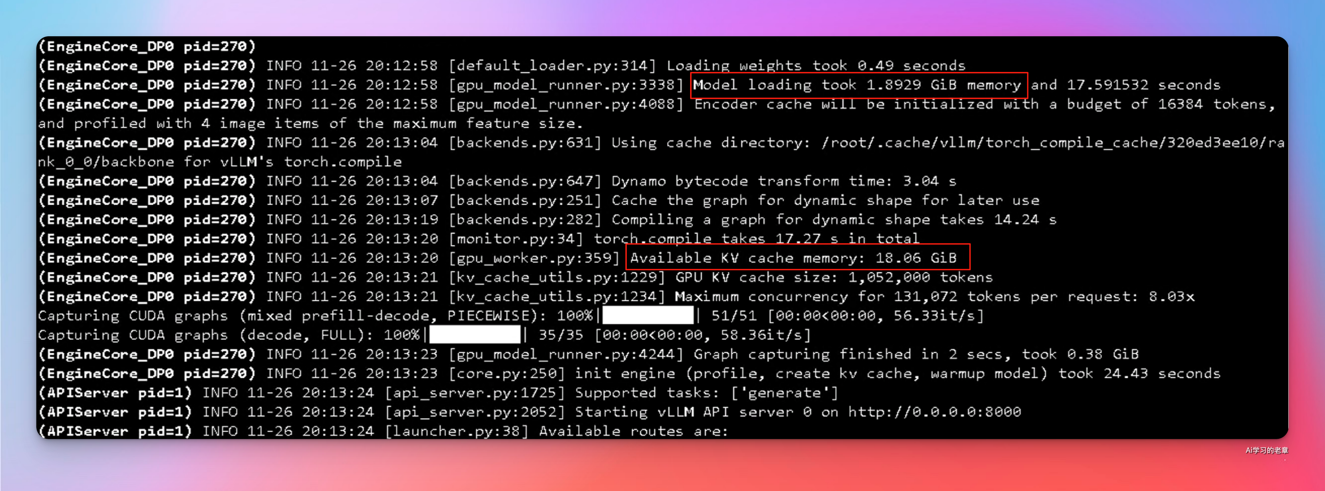 我用单卡 4090 跑,显存的占用只有 1.89GB,剩余空间留给了 KV cache