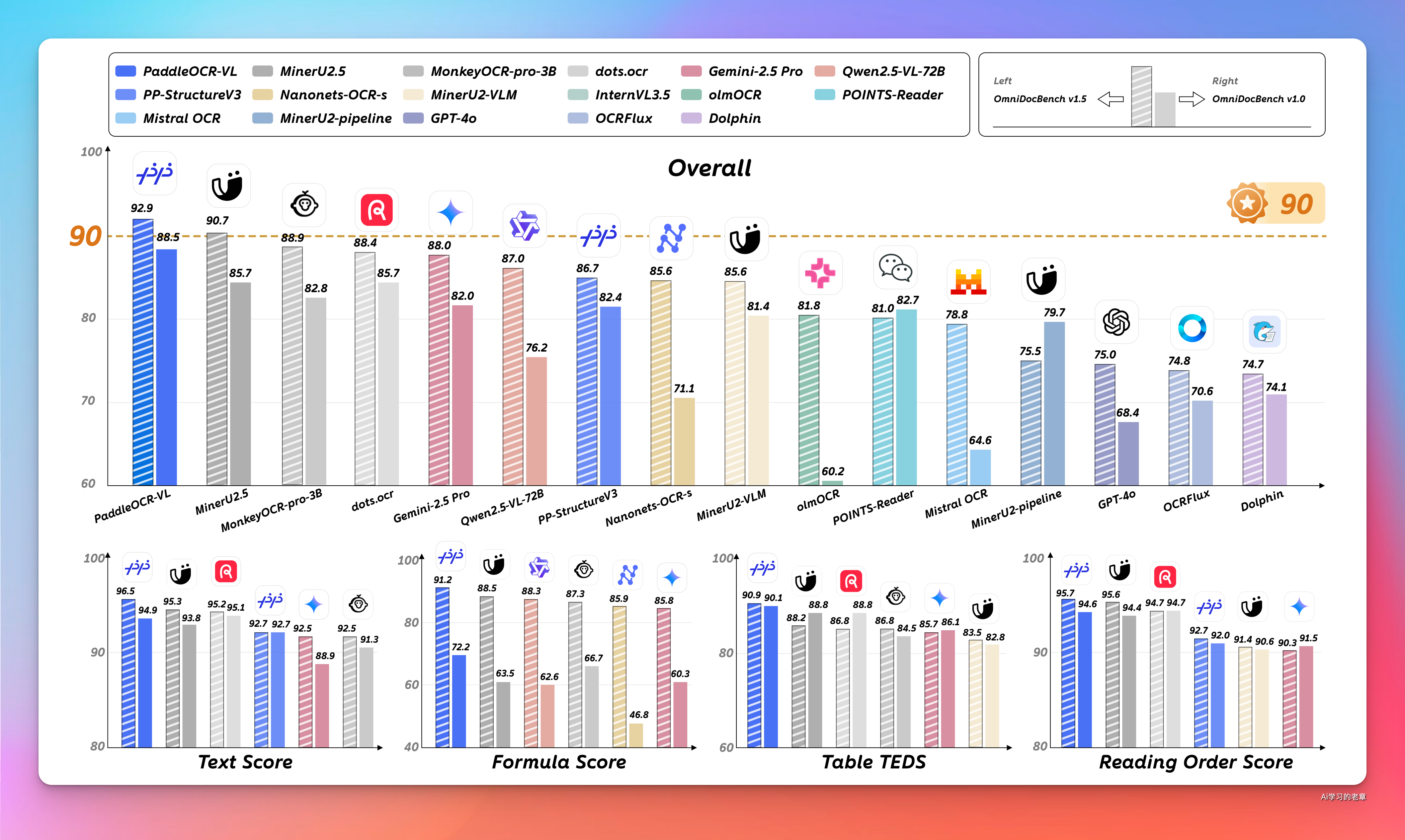 在页面级文档解析和元素级识别任务中,PaddleOCR - VL 都展现出了卓越的性能。在 OmniDocBench v1.5 和 v1.0 等广泛使用的公共基准测试中,该模型在整体、文本、公式、表格及阅读顺序等多项指标上均达到了最先进水平,大幅超越现有的基于管道的解决方案,与顶尖视觉语言模型相比也极具竞争力。这意味着无论是简单的文本提取,还是复杂的表格、公式、图表识别,PaddleOCR - VL 都能出色完成任务。