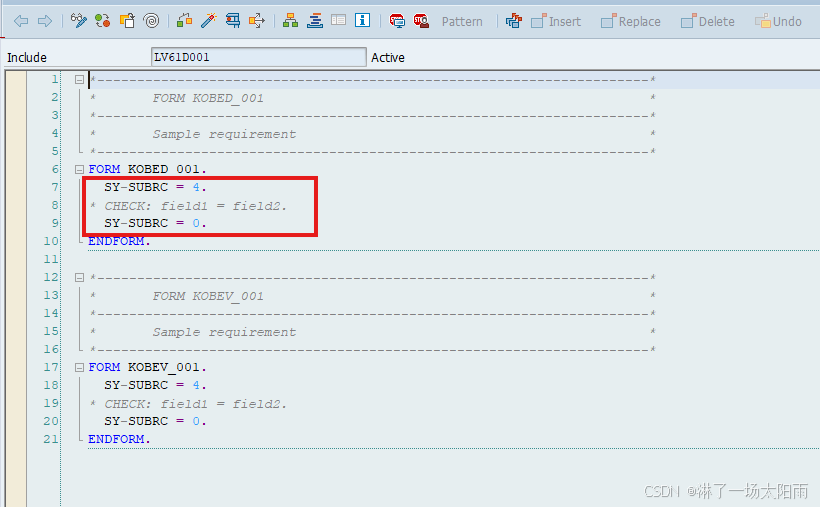 这个requirement routine主要的作用就是返回SY-SUBRC。所以主要的思路就是,进入routine后先对SY-SUBRC赋值4,在这之后判断销售组织或者工厂是否符合,符合则赋值SY-SUBRC为0。