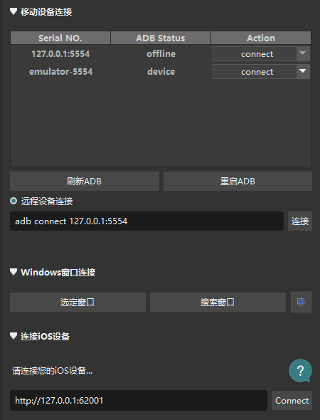 - Airtest 连接:IDE 左侧设备列表点击 "Connect",未识别则点击 "Refresh ADB" 刷新。