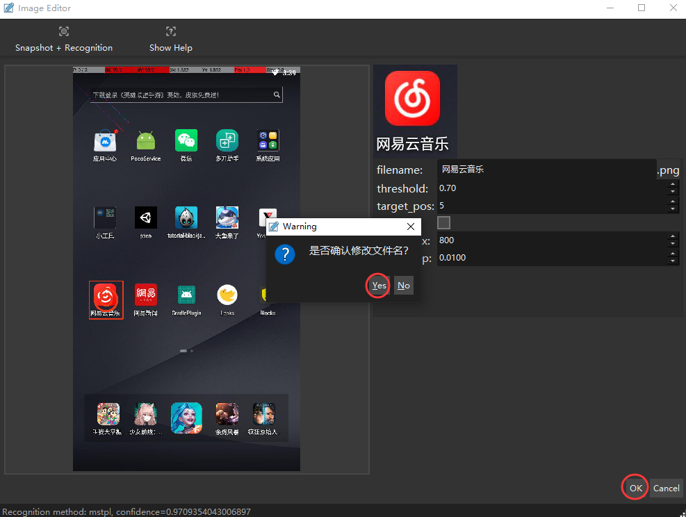 filename为 "网易云音乐.png",点击 OK,弹出 "确认修改文件名" 提示,选择 "Yes"(脚本目录下生成图片副本); - 调整