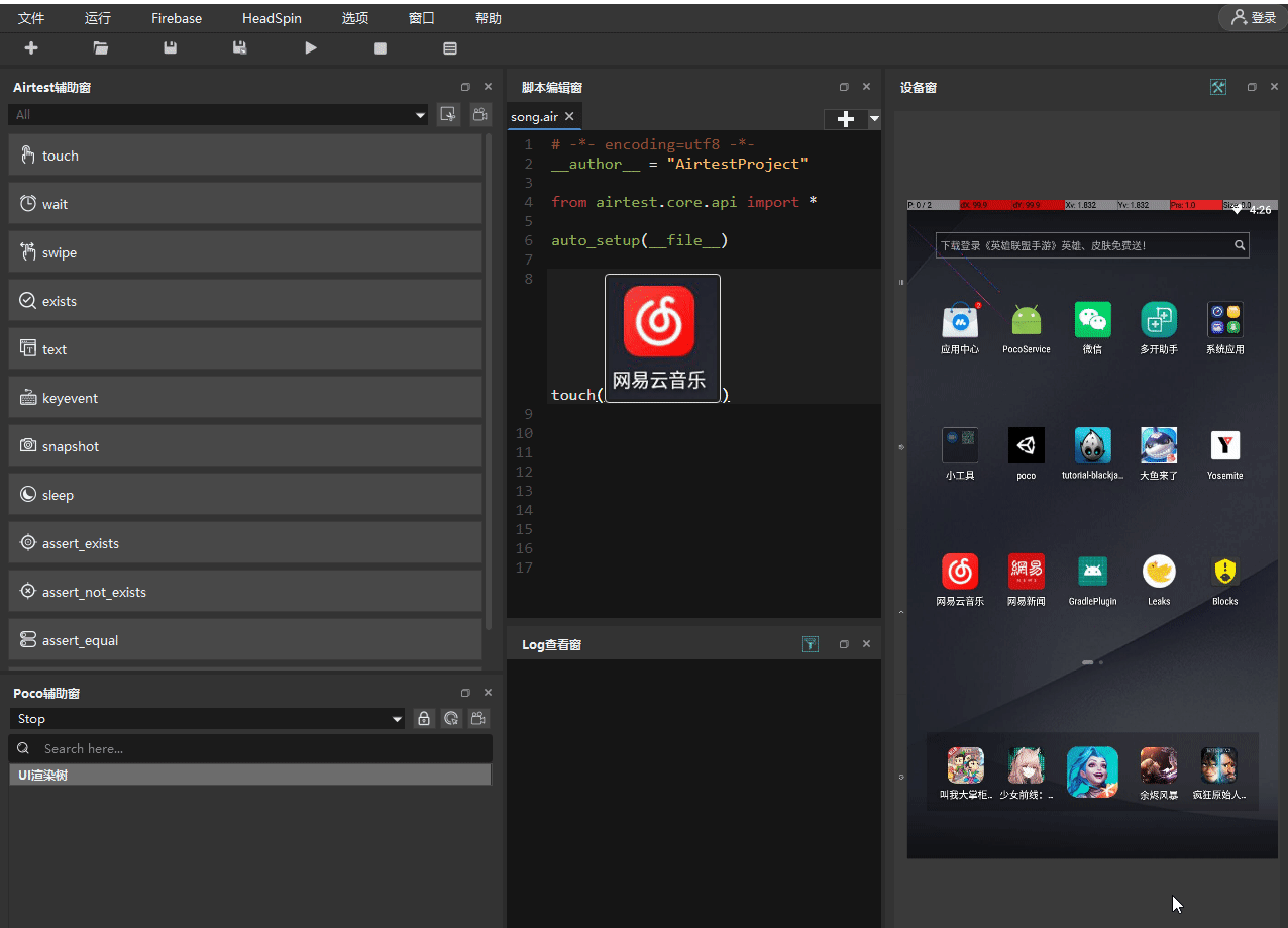 打开 Airtest 辅助窗(右侧),选择操作类型(touch 点击、swipe 滑动、text 输入等);