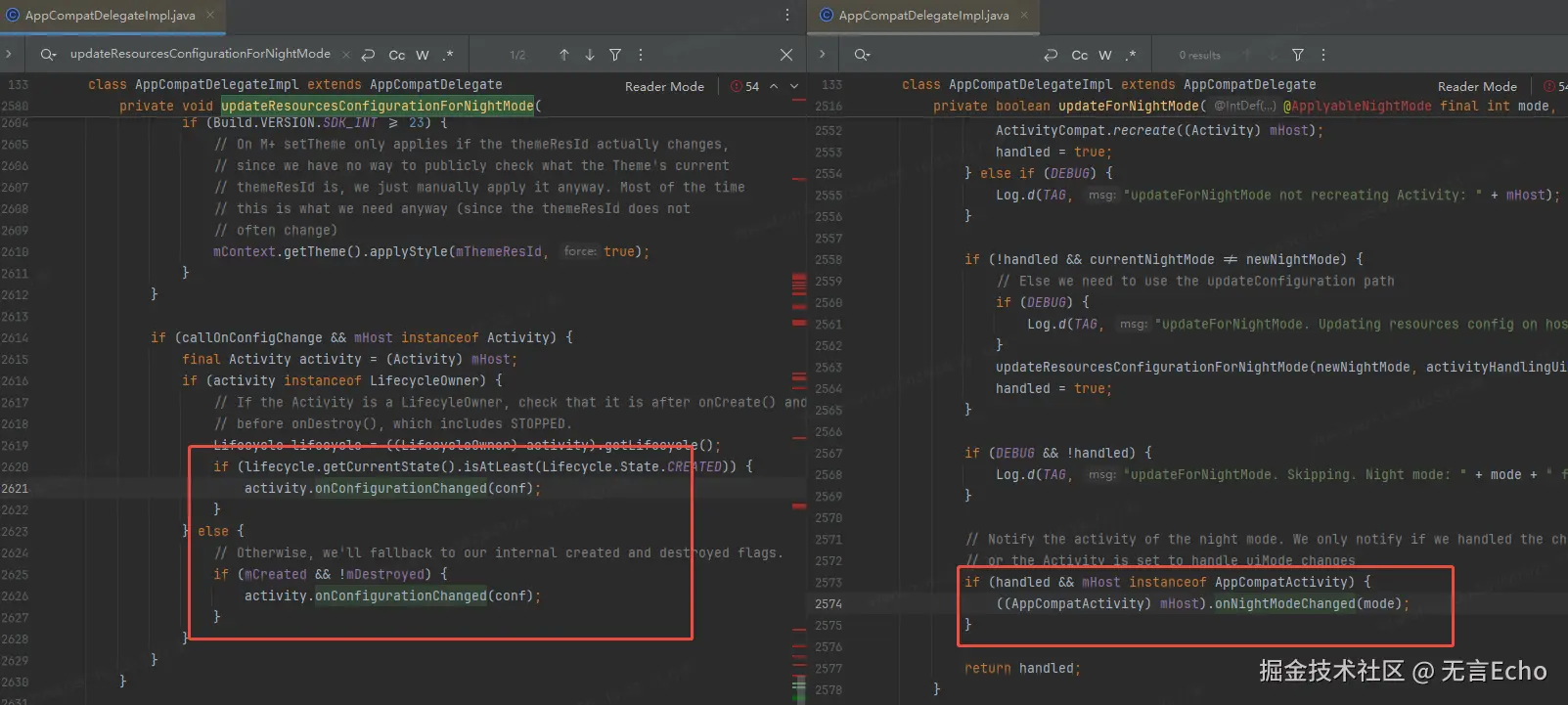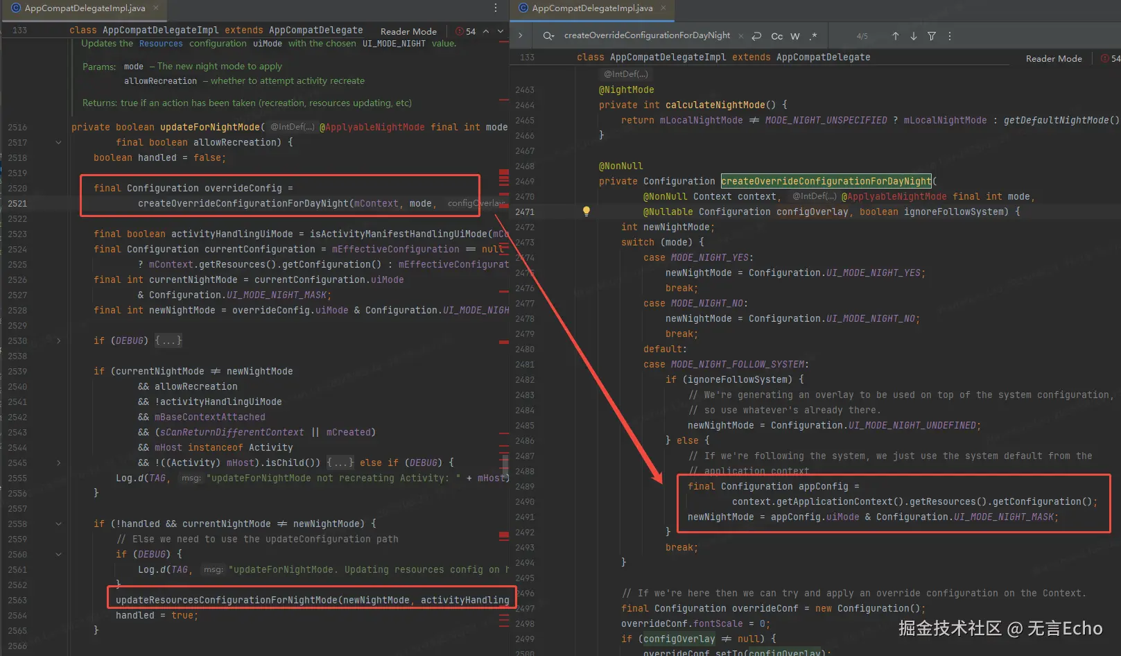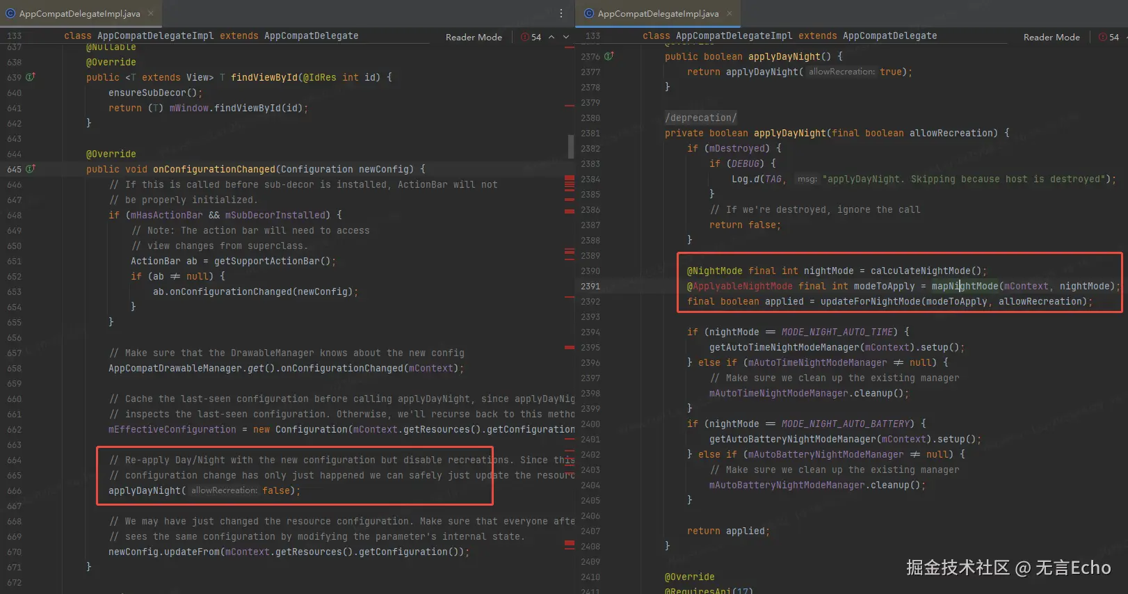 等到后续Application中config更新后,也没有再次通知AppCompatActivity更新,导致AppCompatActivity深色模式一直是错误的状态。