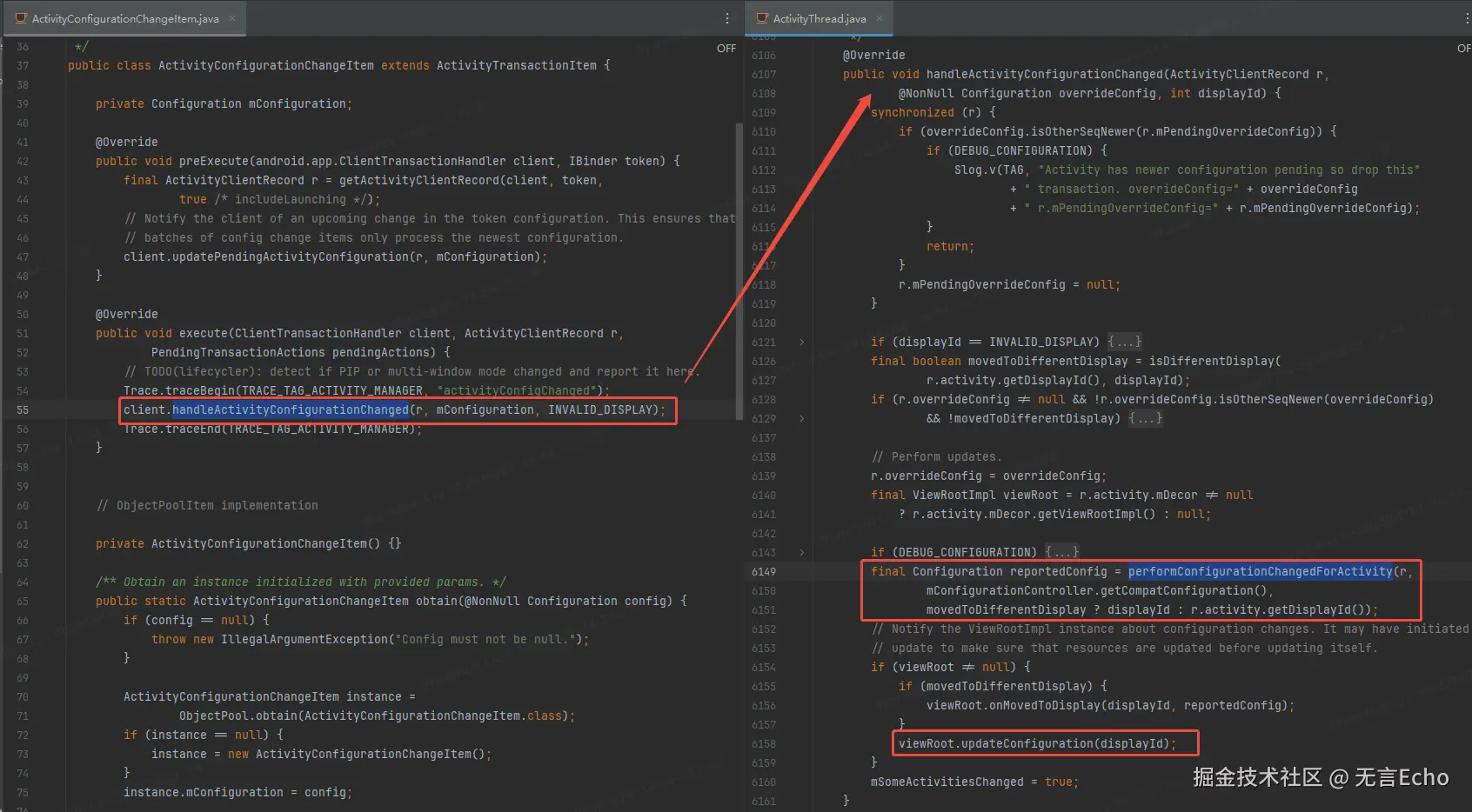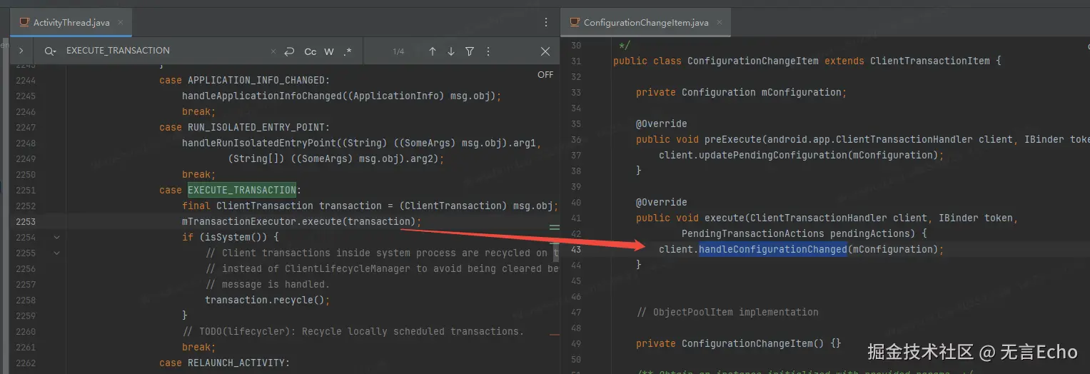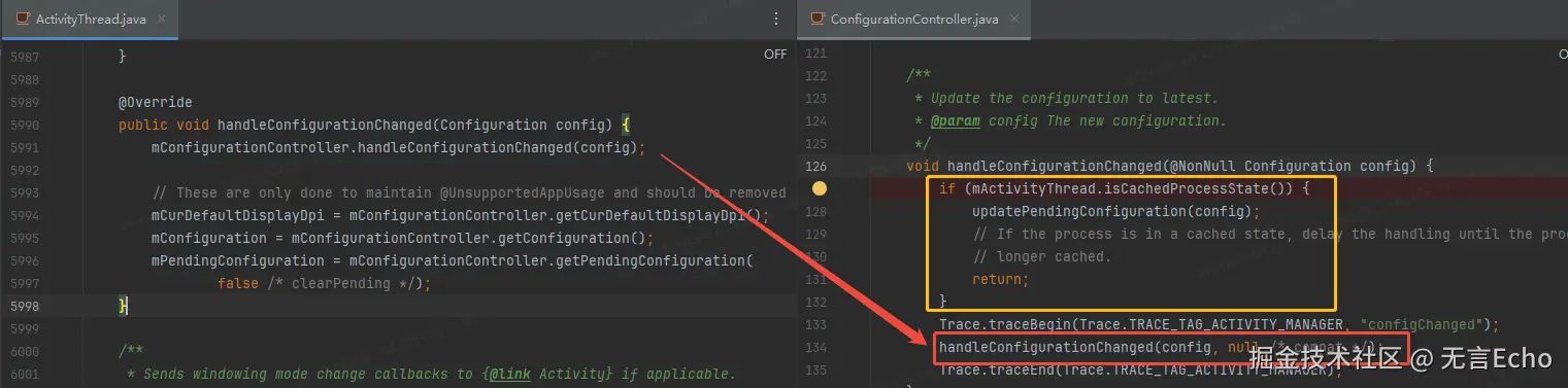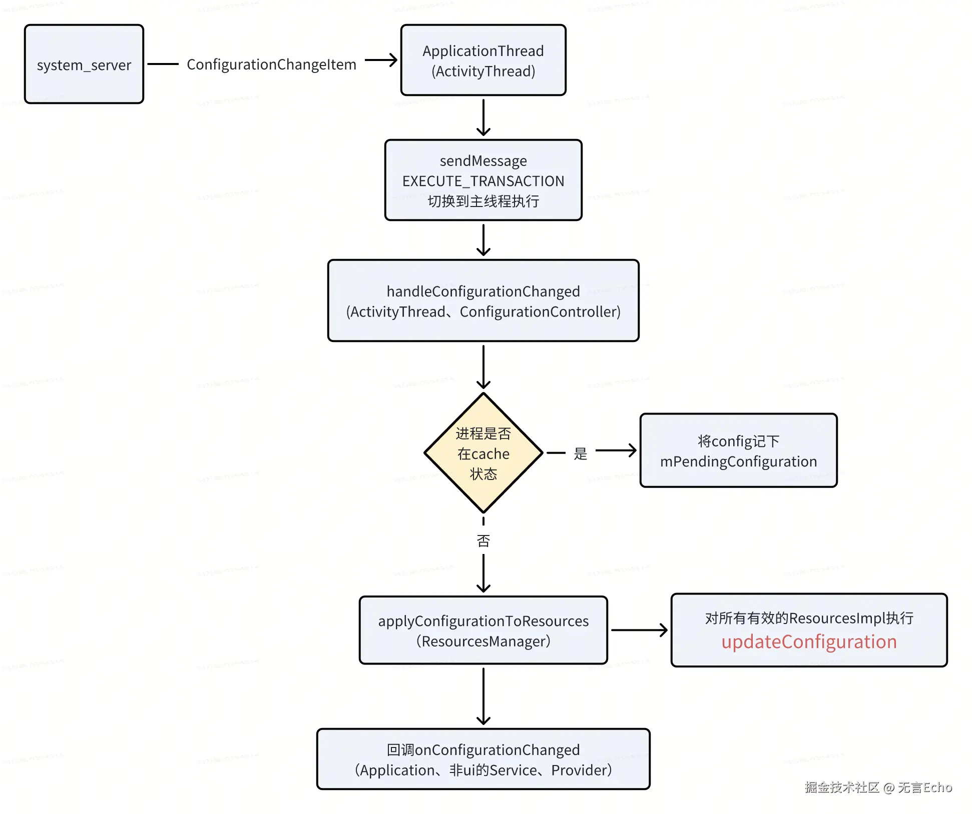 - ConfigurationChangeItem会比ActivityConfigurationChangeItem先发送,即app端会先收到App的config,再收到Activity的config,但是: 进程在Cache状态时即使收到App的config也不会立即处理。