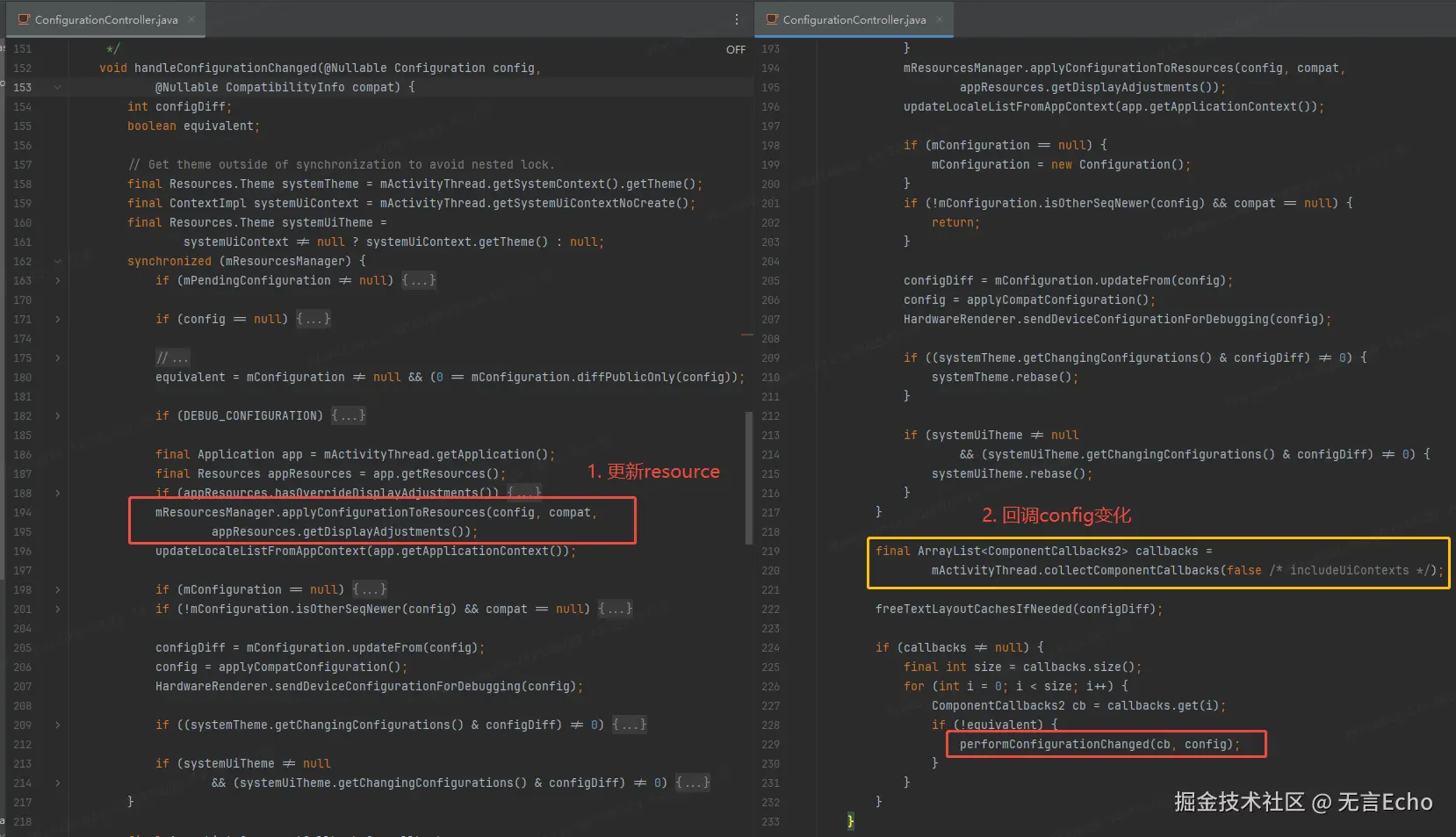 Activity 先更新资源,回调Activity的config变化;然后再更新Application资源,回调Application的config变化。