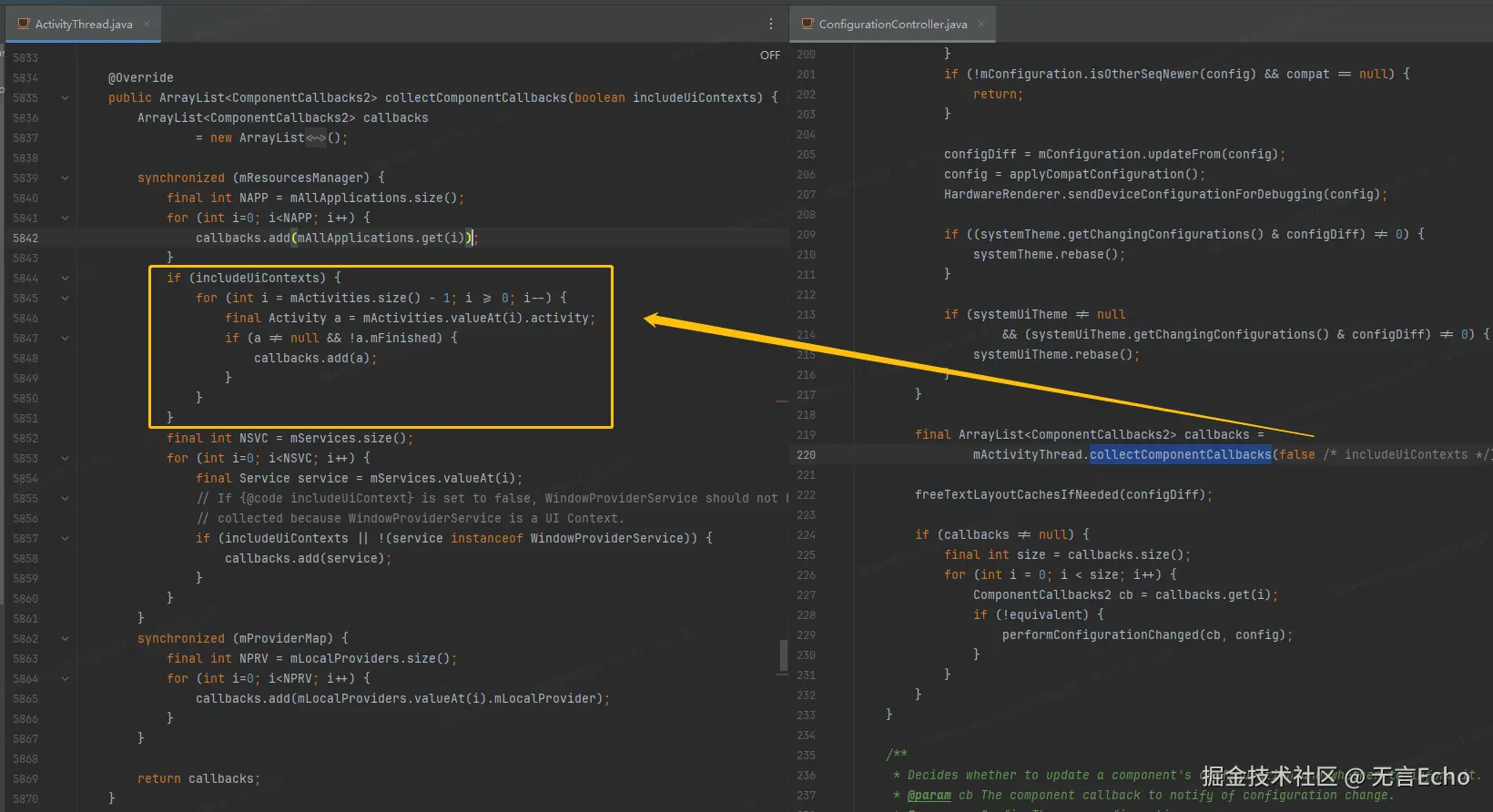资源更新完了之后,来看回调config变化这部分,includeUiContexts参数为false,所以这里也不会回调给Activity。