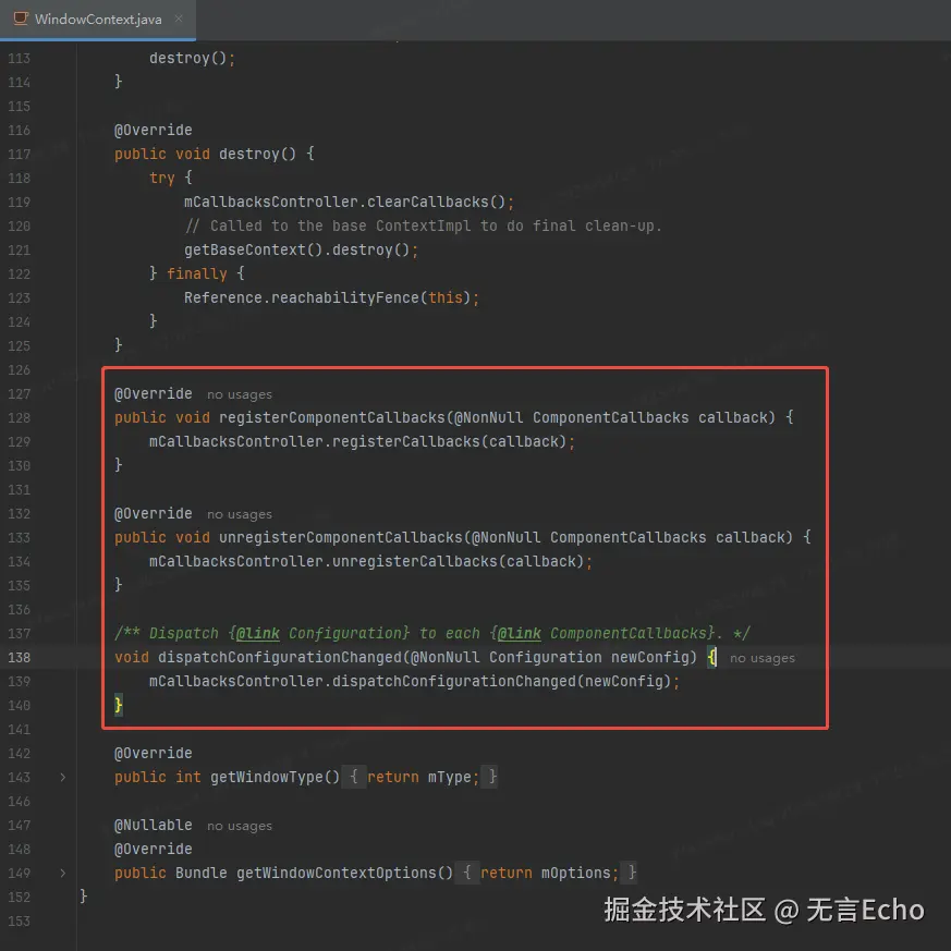 WindowContext内部维护了一个ComponentCallbacksController,注册时会注册到这个mCallbacksController,