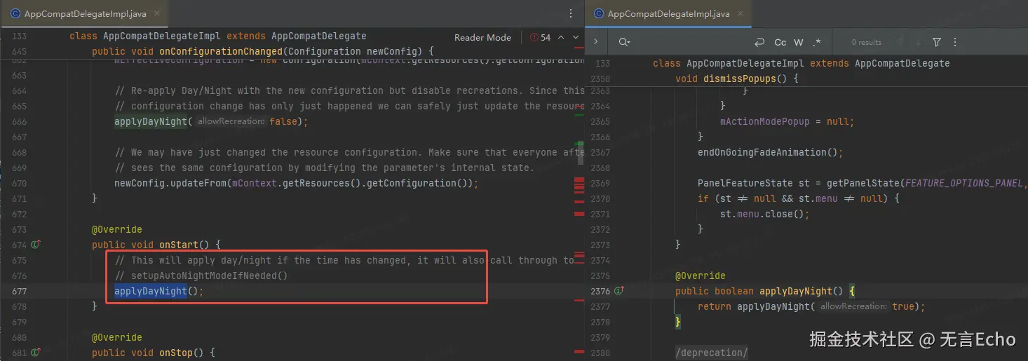 当AppCompatActivity进入后台再回来时,经过onStart,这里会再次更新深色模式(与上面流程一样,默认更新成与Application一致)