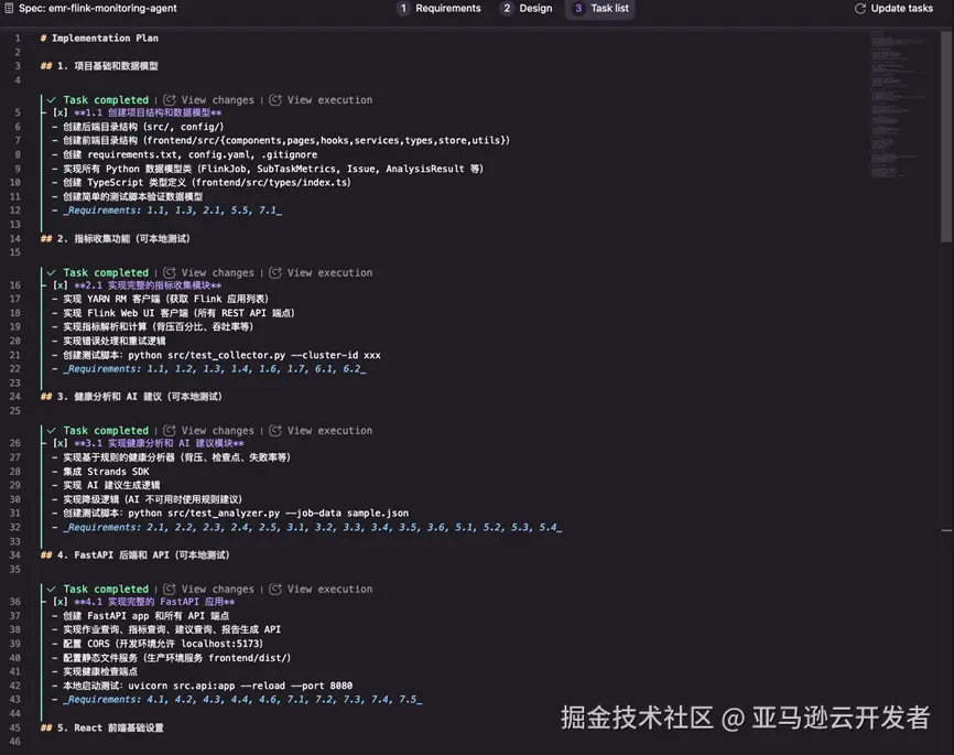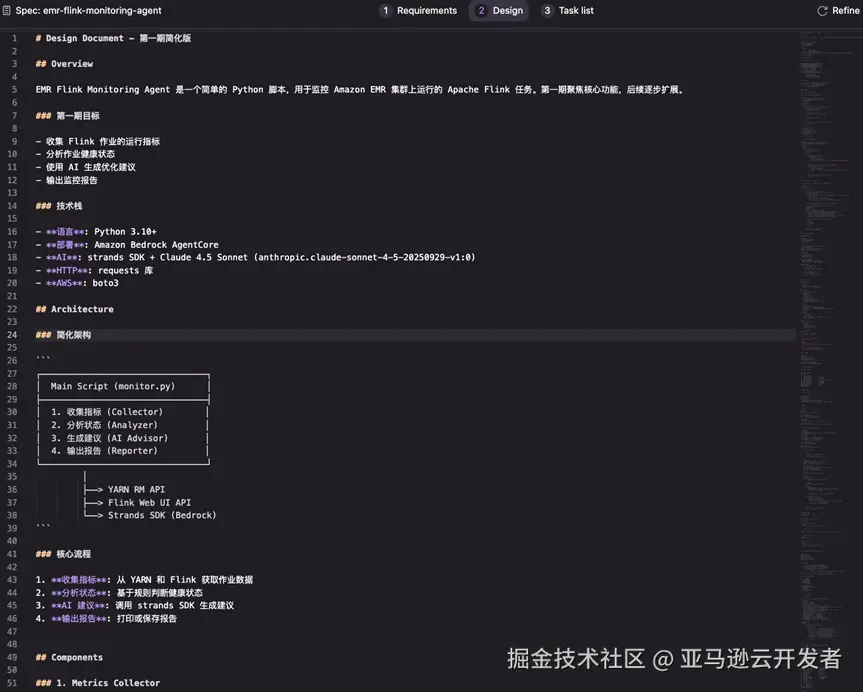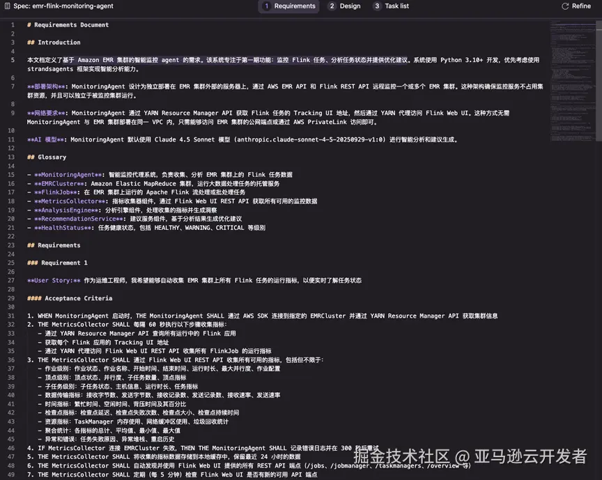 本文介绍如何使用 Kiro AI IDE 开发 Amazon EMR Flink 智能监控系统,重点分享基于 Strands Agents MCP 和 Amazon Data Processing MCP 的开发实践,以及 Spec 驱动开发 的完整流程。