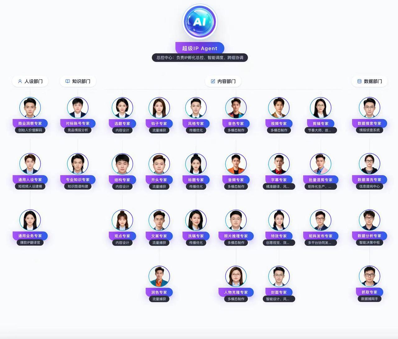 不同于传统的ChatBot,这种架构将复杂的业务流拆解成了几十个垂直的 AI Agent(智能体)。大家可以看到,图中的设计非常有意思:它模仿了真实公司的组织架构,设有"决策层"、"人设层"、"执行层"。