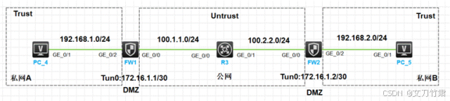 [FW1-Tunnel0]source 100.1.1.1 //指定GRE封装的源IP地址为100.1.1.1
