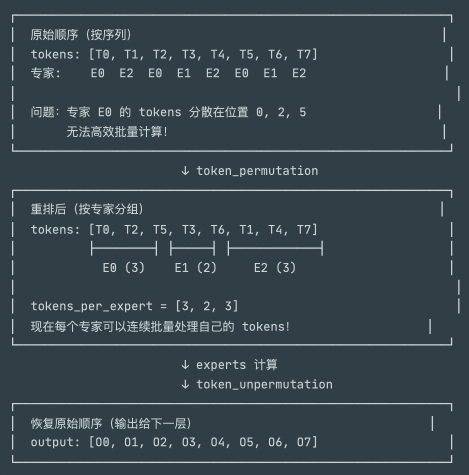 分发之前,先对token重排列(permutation)。原本的token排序是按序列来的,但是不同的专家是要计算不同的token的,所以重排列可以让相同专家的token放在连续的位置。