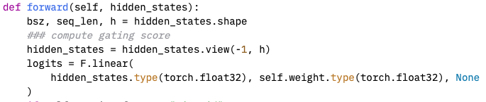 该模块在forward的时候,首先对输入[seq,bs,hidden]做一些扰动(原始Switch Transformers使用,DS不使用),然后input过gating获取logits [seq,bs,e],最后根据logits正式过routing获取分数[seq x bs, e]和routing map [seq x bs, e]。