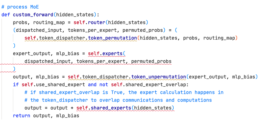 - 序列实现使用的是sequentialMLP,实现非常简单。把输入按照tokens per expert拆分,然后for循环每个专家乘。速度慢,但是整体实现复杂度比较低。