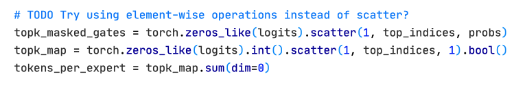 以下三行比较绕。第一行:生成一个mask,[num_tokens, experts],选中的专家那个元素设置为对应的专家概率分数,没选中的为0;第二行:选中的专家为True,没选中的位置为False;第三行:每一列的值求和,每个专家有多少个token。