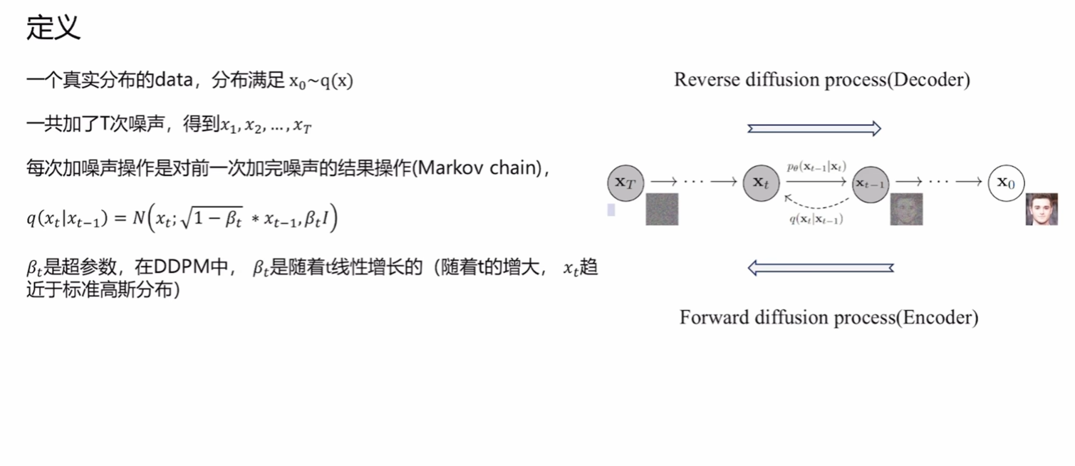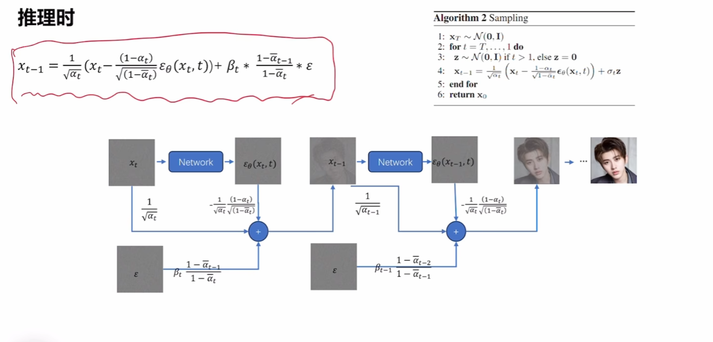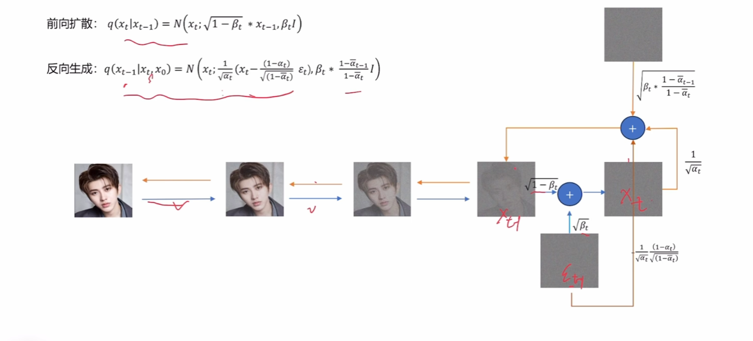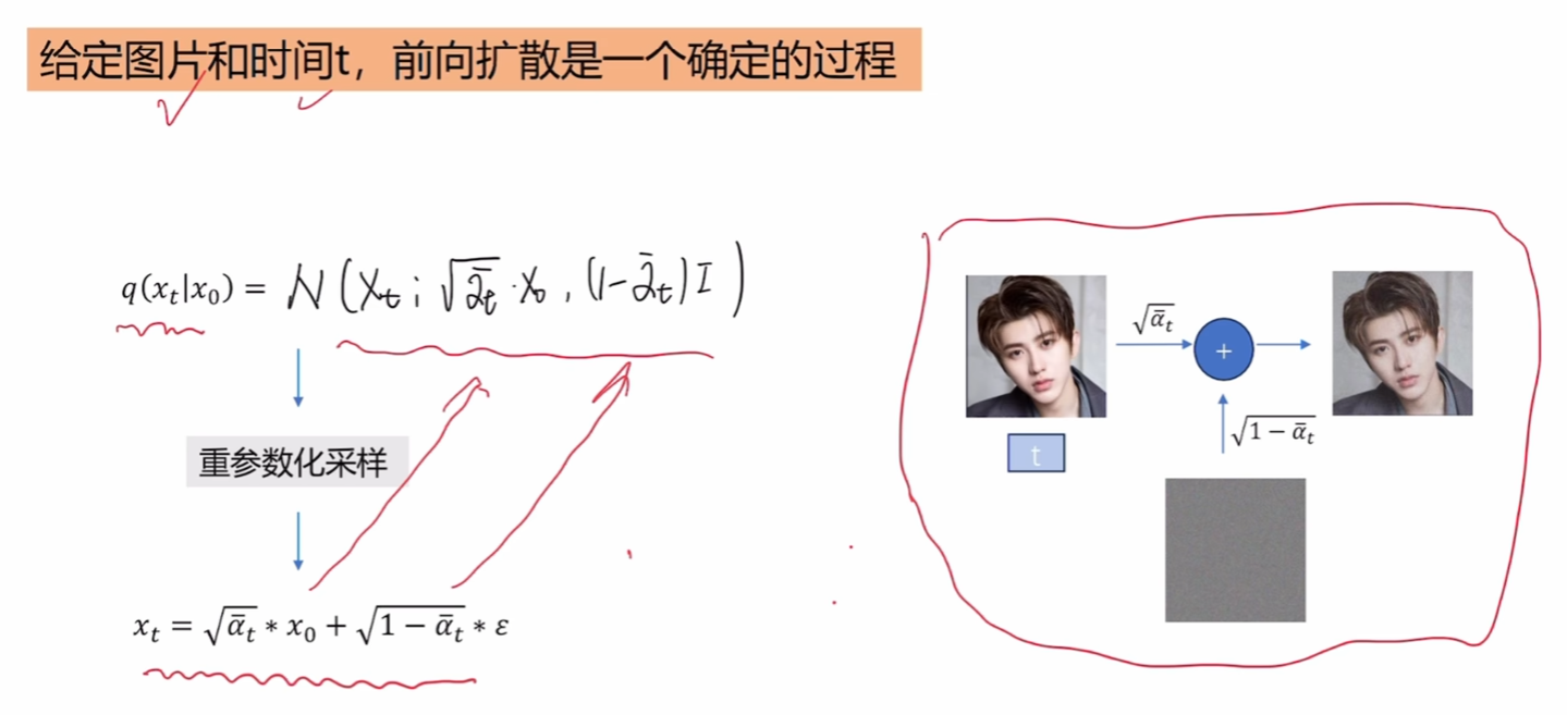 前向传播通过上述的式子,不断地在图片中增加噪声。β\betaβ是可以人为设定的超参数。