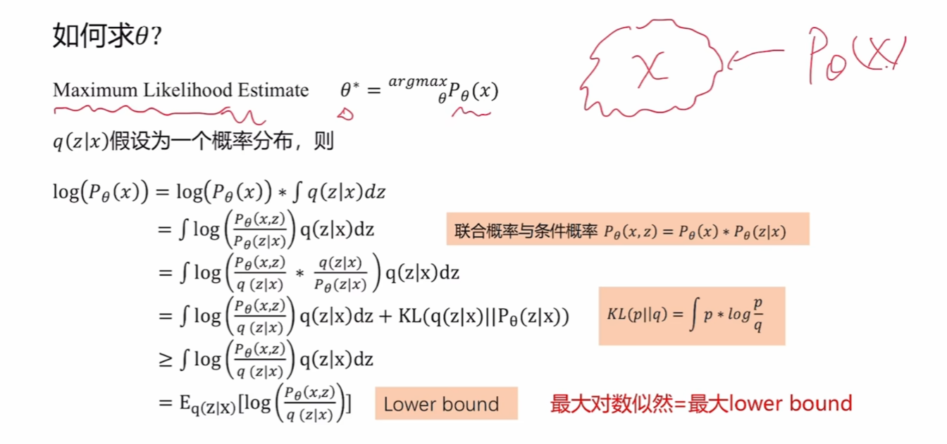 x是我们观测到的数据,按照眼见为实的思想,我们需要调整参数使构建的模型出现观测数据的概率尽可能的大。这里的公式是在求解最大似然估计的下界,是在处理复杂问题时的简化。