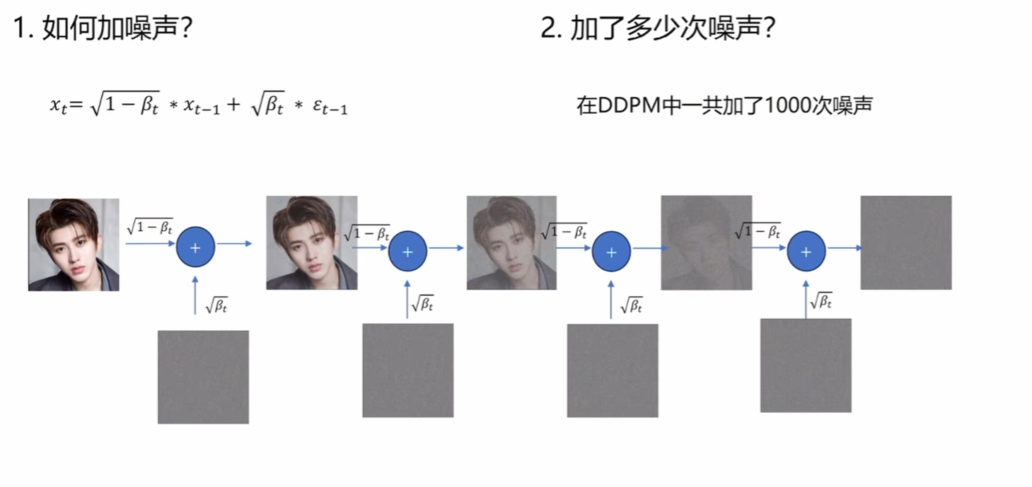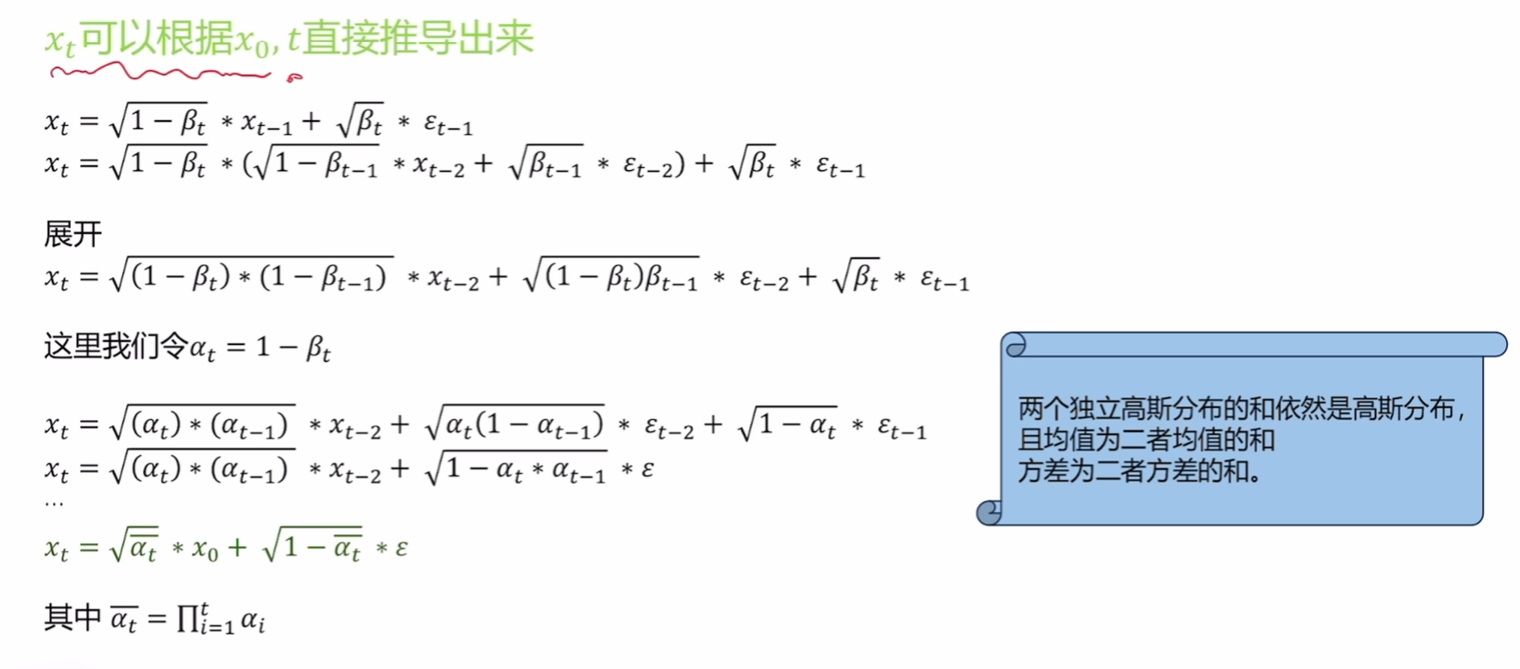 论文中一共做了T = 1000次加噪,由于β\betaβ小于1,最后分布会趋近于标准高斯,具体可看下面这个推导: