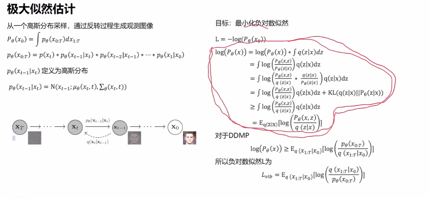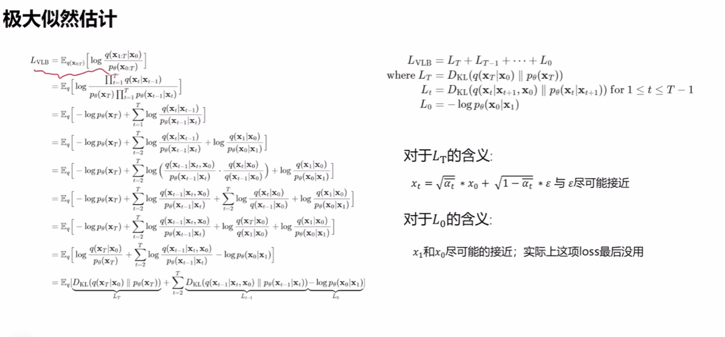 - 第二个式子:生成x0x_0x0的某一条路径,这其实是一条马尔可夫链,我们要用T个网络恢复成原图,因此要乘以T个分布。
