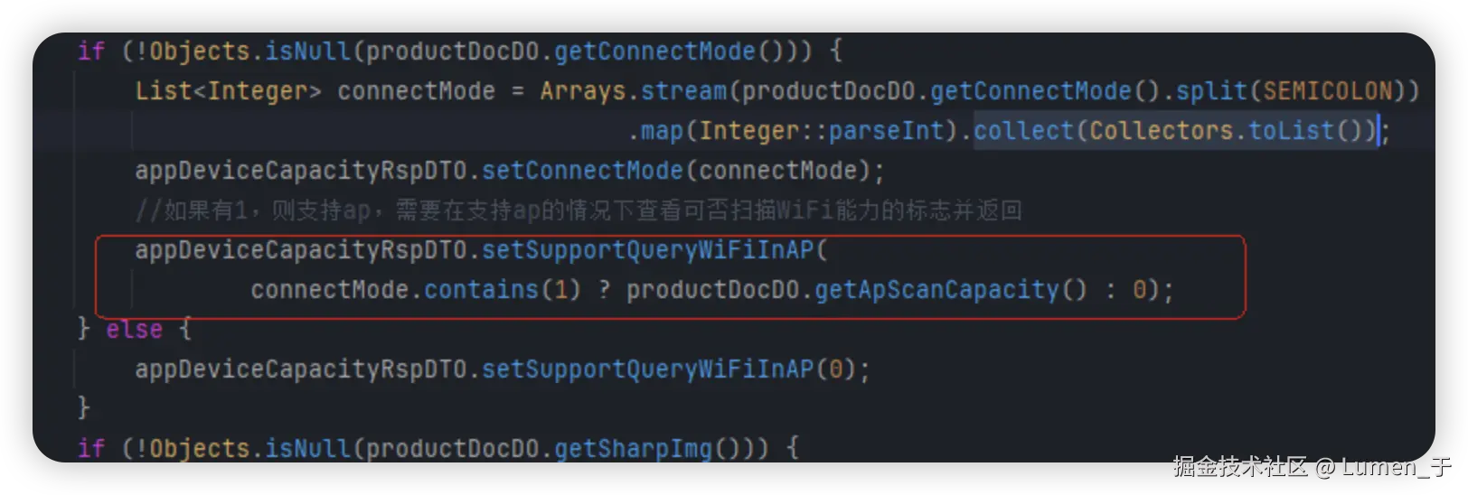 若connectMode.contains(1)报NPE,代表需要查看stream运算是否返回nullproductDocDO.getApScanCapacity()可能会有三元运算符的自动拆装箱产生的NPE