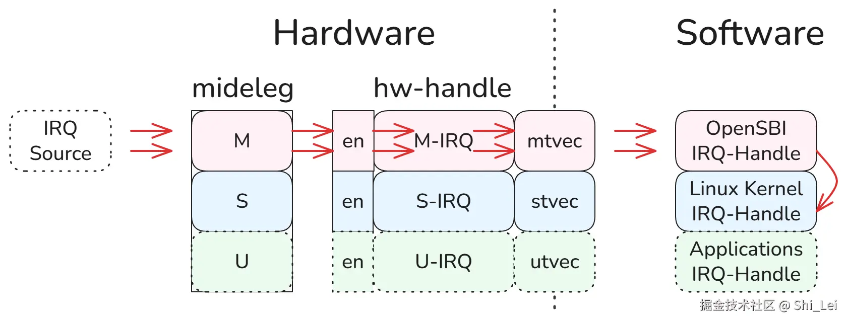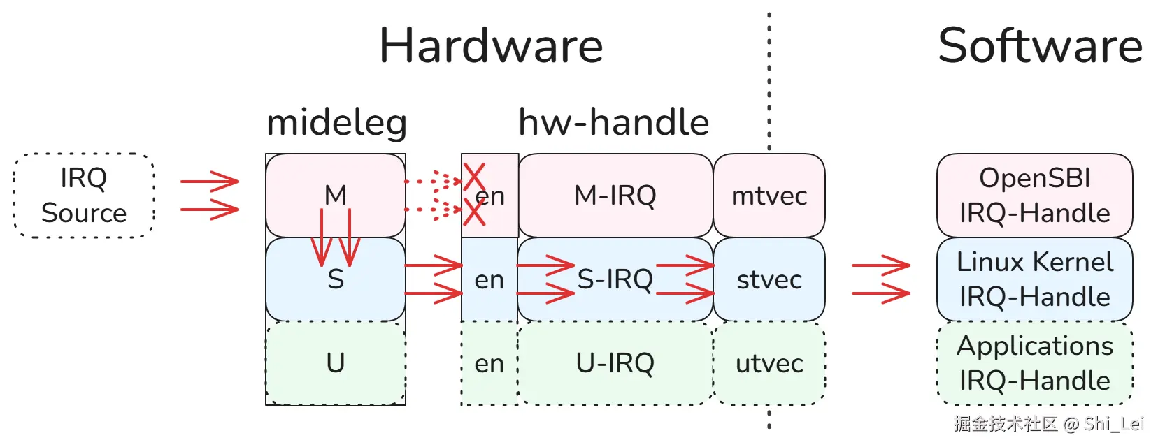 - 对于mext的处理路径:mext不会被路由委托,仍然试图沿着M-IRQ中断处理通道前进(红色虚线箭头),但是OpenSBI会在引导Linux Kernel之前,关闭M态的那个en开关,在那之后,mext的处理路径在硬件层面就被截断了。这样的效果是,Linux启动后就接管了所有的中断处理,OpenSBI不再参与,整体上的性能较好。