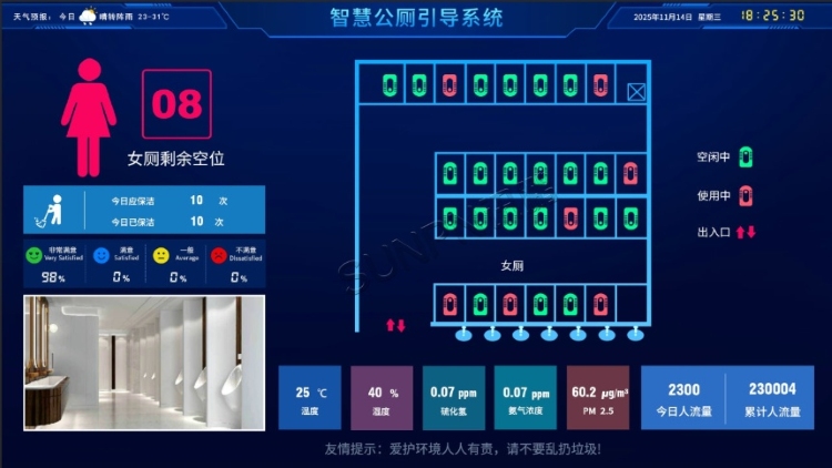 旅客对公厕的体验直观影响对整体满意度有着直接作用。智慧公厕通常具备自助指引、语音提示、环境音乐、洁具智能冲洗、强力干手设备等人性化设计,提升使用的便捷性与舒适度。更重要的是,"可视化排队与拥挤信息"功能,让旅客知道最近的空位及等待时间,减少焦虑和不满。同时,智能门禁与无障碍设计的无缝对接,方便不同人群的使用,体现对多元需求的关注。