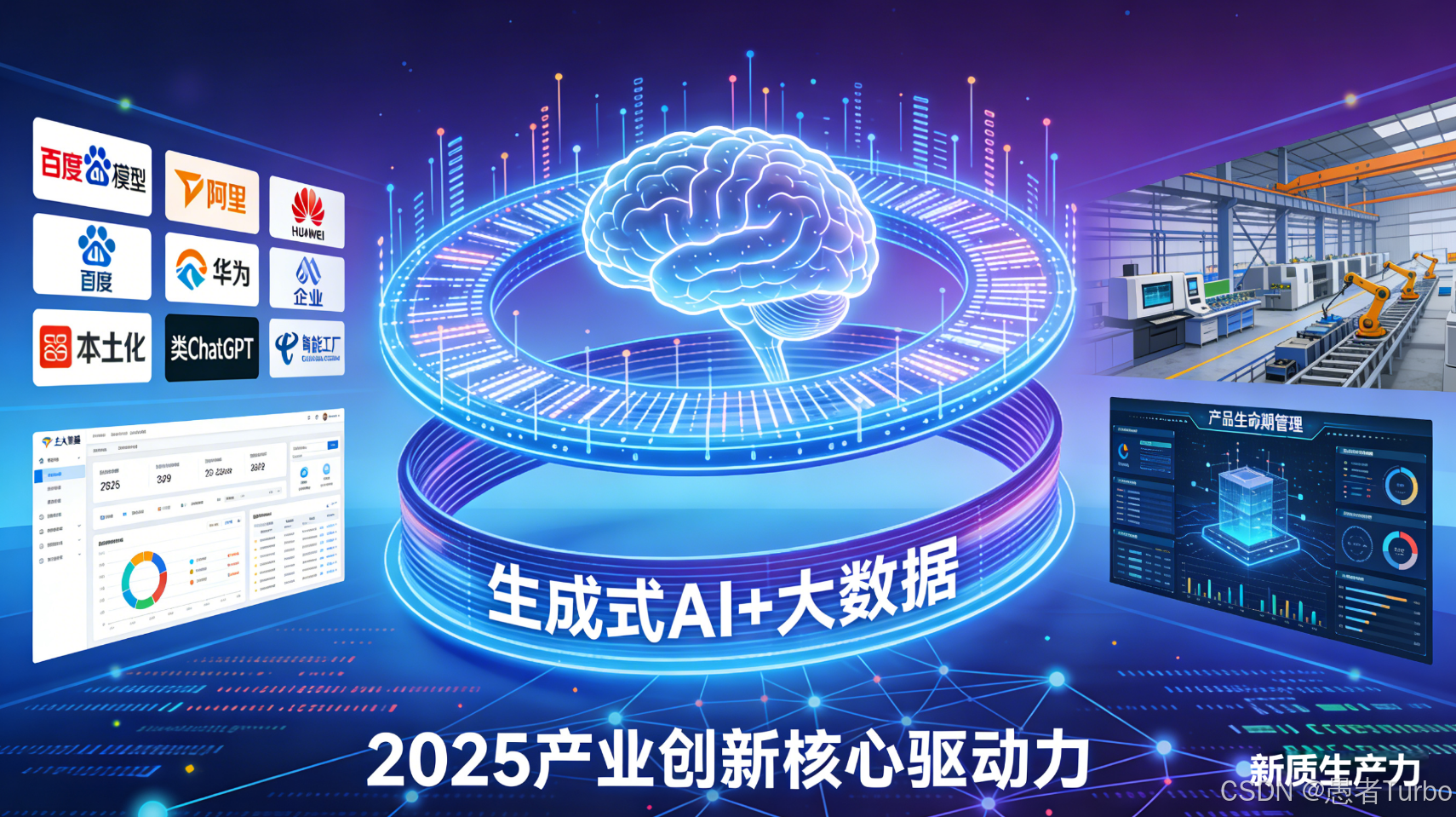 2025年,大数据与AI的融合进入新阶段,生成式AI与大数据技术的结合成为产业创新的核心驱动力 。百度、阿里、华为等科技公司相继推出本土化的"类ChatGPT"生成式AI产品,这些具备更大语料库、更强计算能力、更通用预训练和更强自我学习能力的产品,为优化传统工业互联网赋能方式、助力工业产品全生命周期的效率和质量提升带来更多可能性。