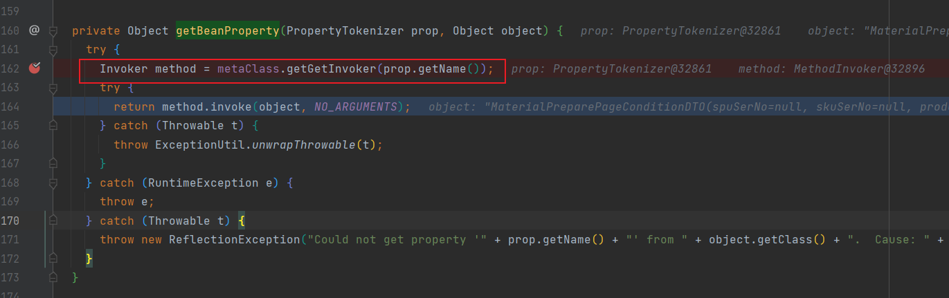 然后一路往下跟踪到BeanWrapper中的metaClass.getGetInvoker方法,在其中看到了查询get方法的逻辑