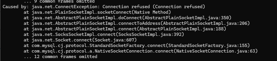 意思是我的 Spring Boot 项目启动时,尝试连接 MySQL 数据库但连不上,具体原因是 Connection refused(连接被拒绝)。
