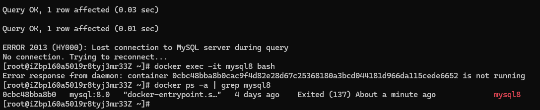 Exited (137):表示容器已经退出,退出码137通常是因为容器被强制杀死(比如内存不足、系统 OOM),这就是容器停掉、连不上的直接原因。