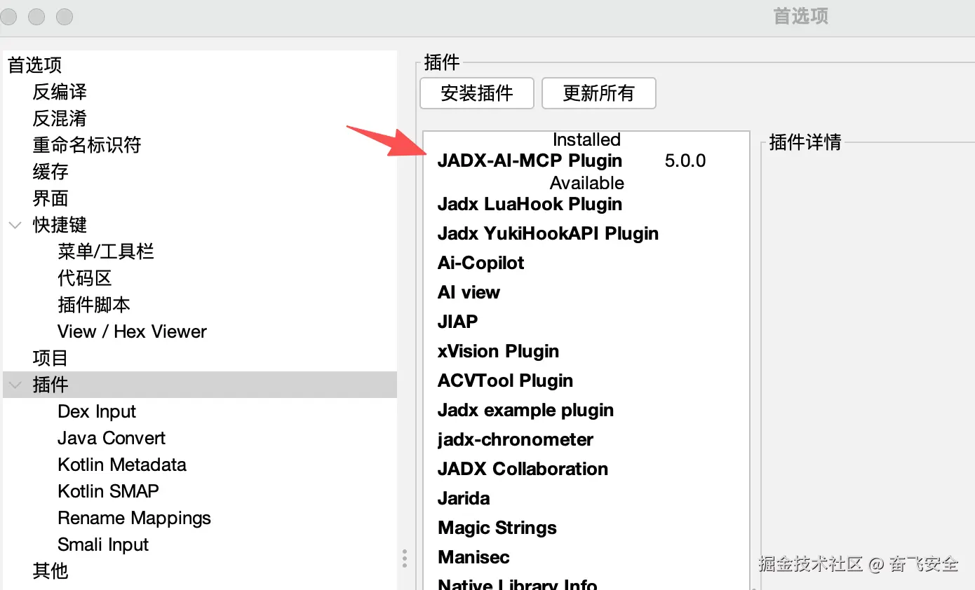 就用之前的 91fans.com.cn/post/txtrea... ,咱们换AI来搞 Jadx打开,然后 文件 -> 首选项 -> 插件
