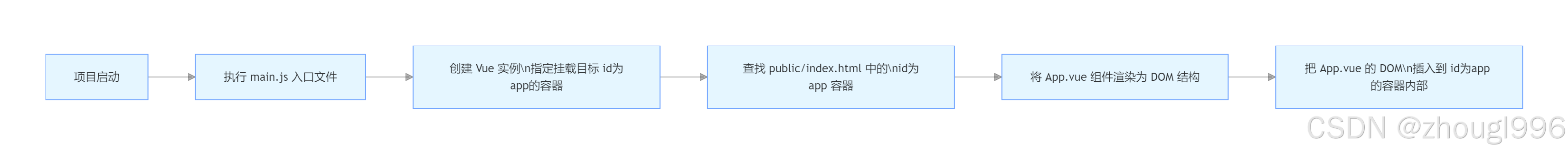 Vue 项目启动时的核心挂载流程如下,这个流程能清晰解释两者的配合逻辑: