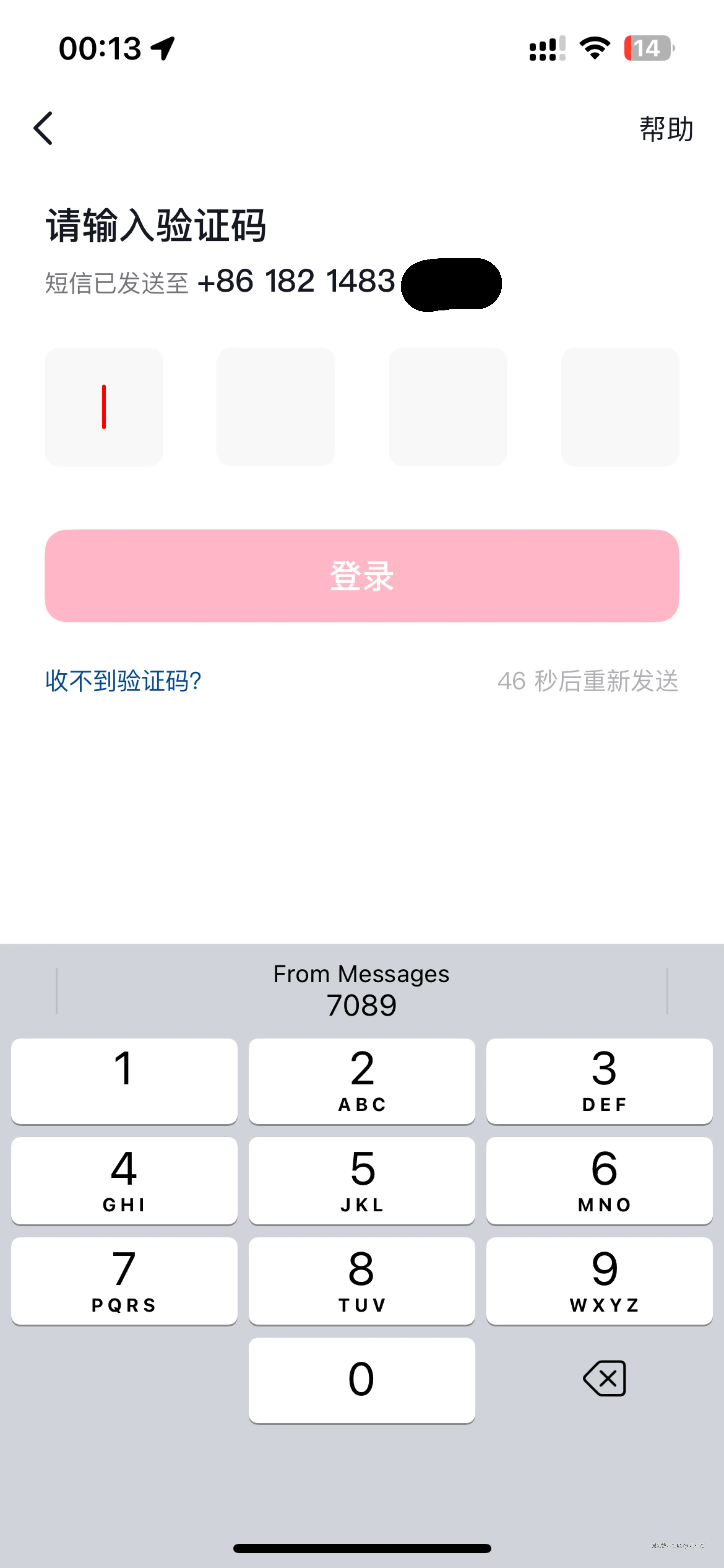 还是以某音的登录验证码输入框为例,拆解下需求,首先是有四个验证码输入方框,然后输入的过程中游标会随着输入的验证码位数移动,另外游标会在界面展示的时候一直闪烁。某音验证码输入框的图片如下: