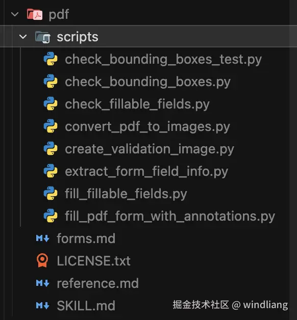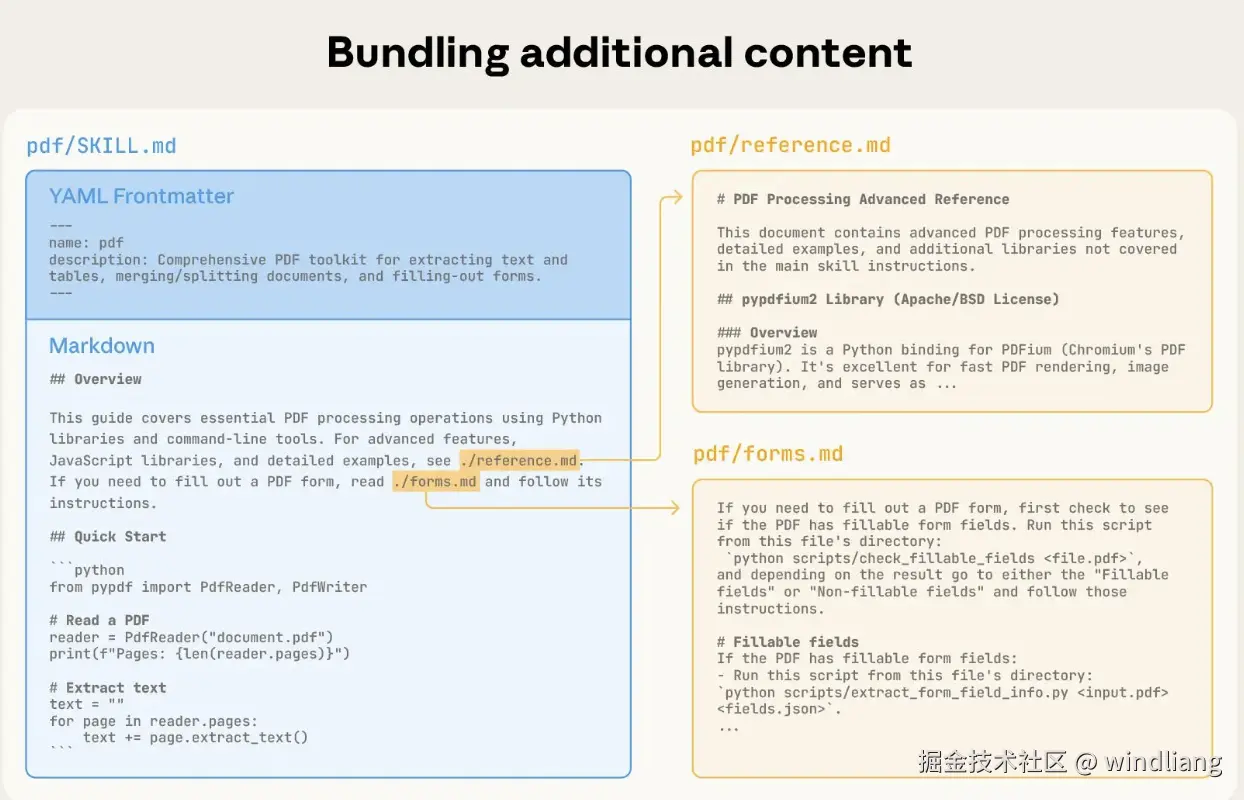 最关键的在于 If you need to fill out a PDF form, read forms.md。这就是之前说的渐进式展开的能力,一个技能我们可以提供很多文档,但 agent 不会一次性读取,它只有需要的时候才去读取。