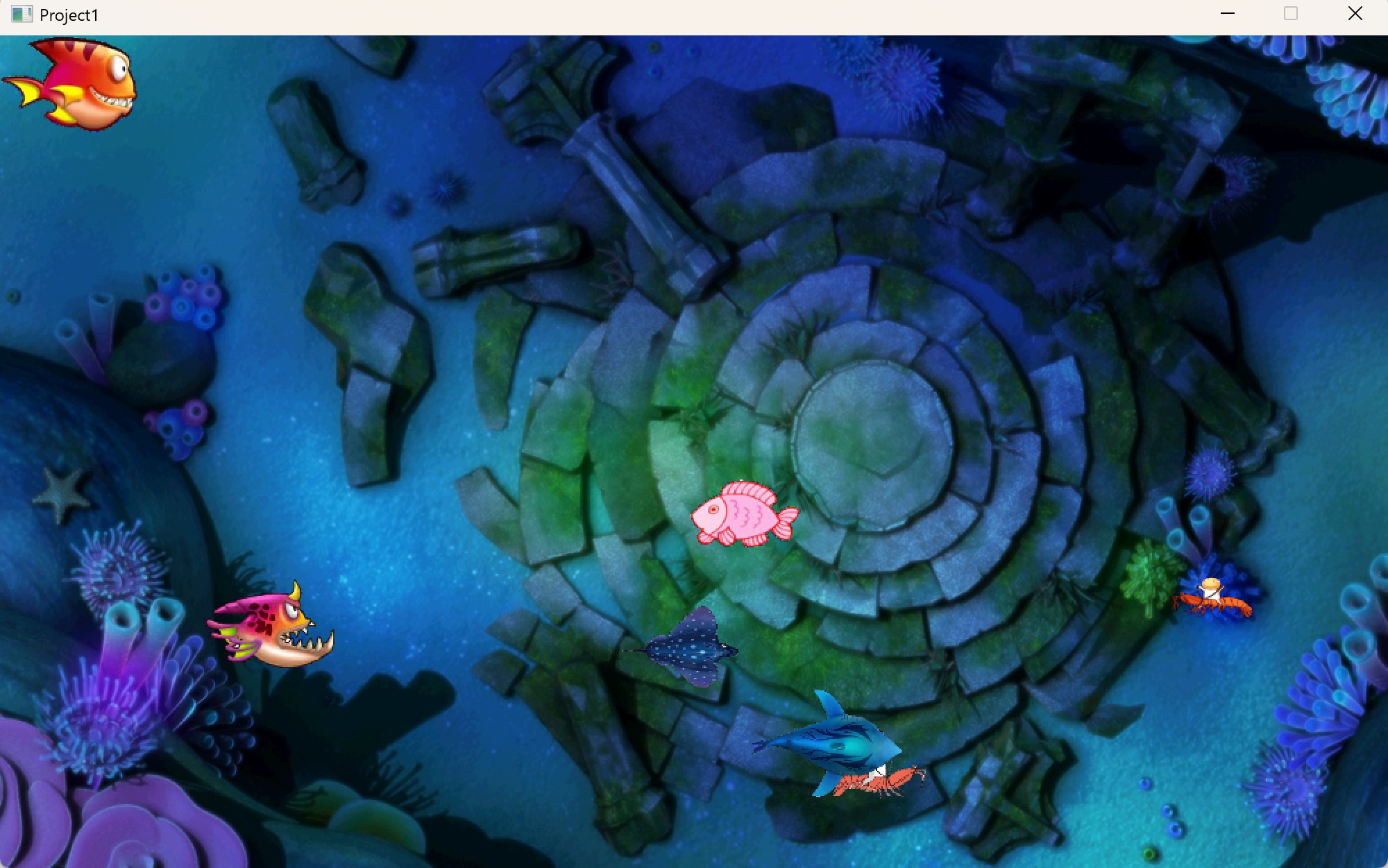 - 敌对鱼缓慢左右移动(每10ms一帧),遇到边界自动反弹。