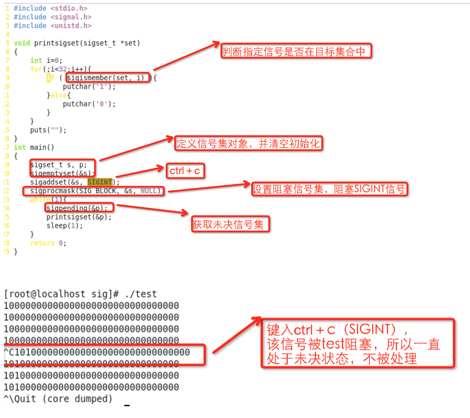 这四个函数都是成功返回0,出错返回-1。sigismember是一个布尔函数,用于判断一个信号集的有效信号中是否包含 某种 信号,若包含则返回1,不包含则返回0,出错返回-1。