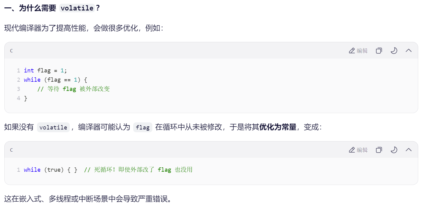 volatile 是 C/C++ 中的一个关键字 ,用于告诉编译器:这个变量的值可能会在程序"不知情"的情况下被改变 (比如被硬件、中断、其他线程修改),因此禁止对该变量进行某些优化,每次访问都必须从内存中重新读取,而不是使用寄存器中的缓存值