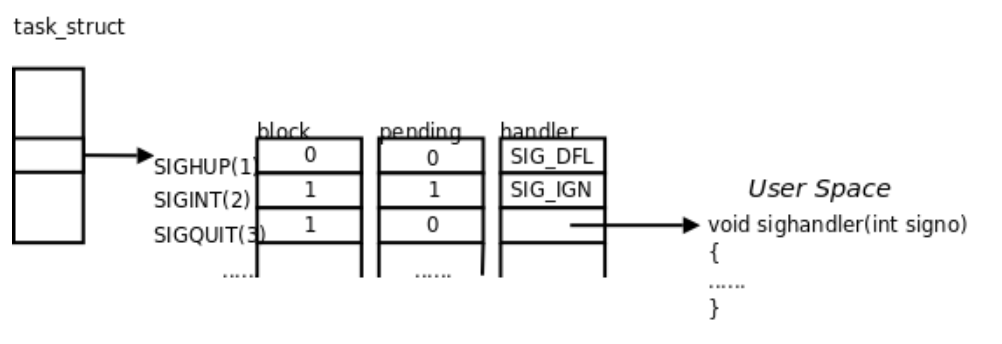 每个信号都有两个标志位分别表示阻塞(block)和未决(pending),还有一个函数指针表示处理动作。信号 产生时,内核在进程控制块中设置该信号的未决标志,直到信号递达才清除该标志。在上图的例子 中,SIGHUP信号未阻塞也未产生过,当它递达时执行默认处理动作。