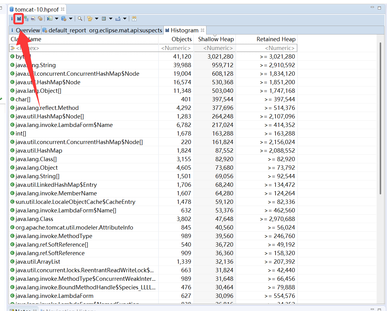 jmap -dump:format=b,file=/root/tomcat-10.hprof 1574