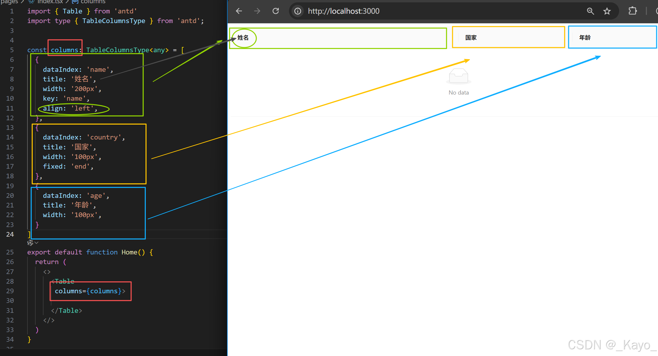 columns配置数组中每个元素都是对象,每个对象是table中某一列的表头配置。