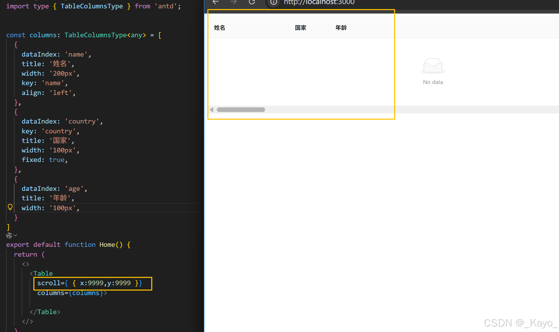 但是,此时fixed和width都没有生效,想让他们生效,需要给table设置scroll属性,