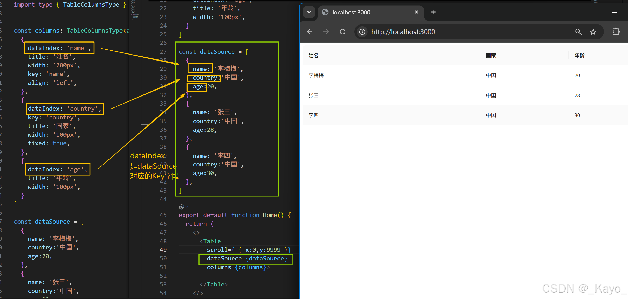 dataSource的绑定值是数组,数组中每个对象是一行数据: