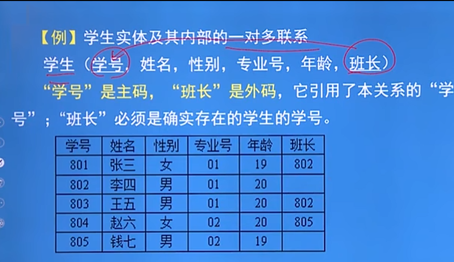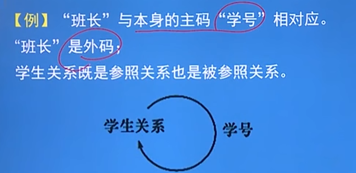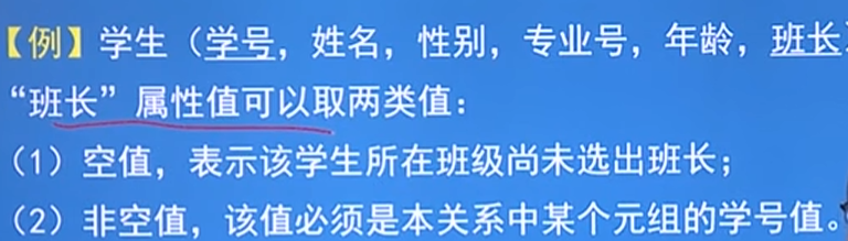 外码要么取空值(班长) 要么取被参照关系里某个元组的主码值