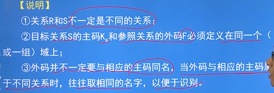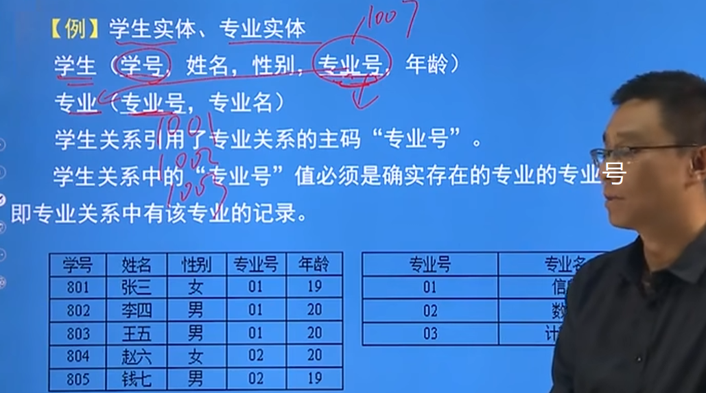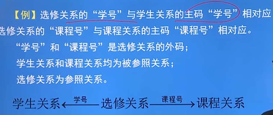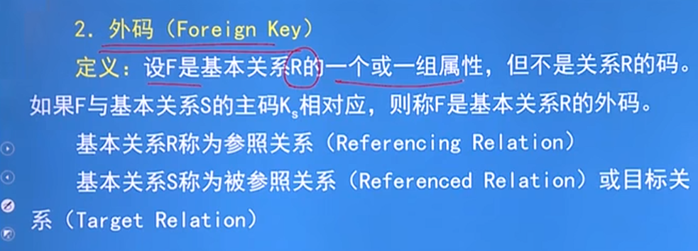 外码:一个或一组属性与别的关系的主码相对应 而不是自己所在关系的码 则称这个或组属性为这个关系的外码,比如前面专业号是学生表的属性,不是码;但是与专业表的主码对应,这时候我们说专业号是学生表的外码;学生表为参照关系, 专业表为被参照关系