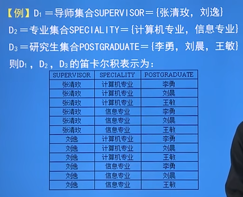 笛卡尔积可表示为一个二维表。表中的每行对应一个元组,表中的每列对应一个域(也就是属性范围)。